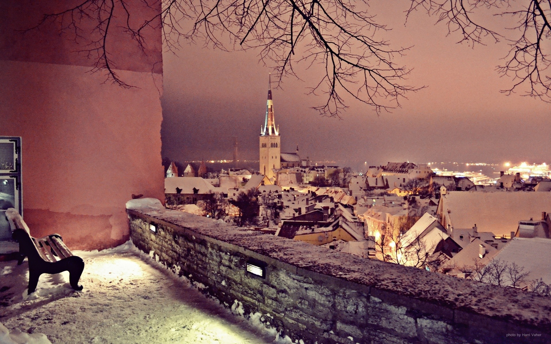 View from the balcony to the snow-covered roofs of houses