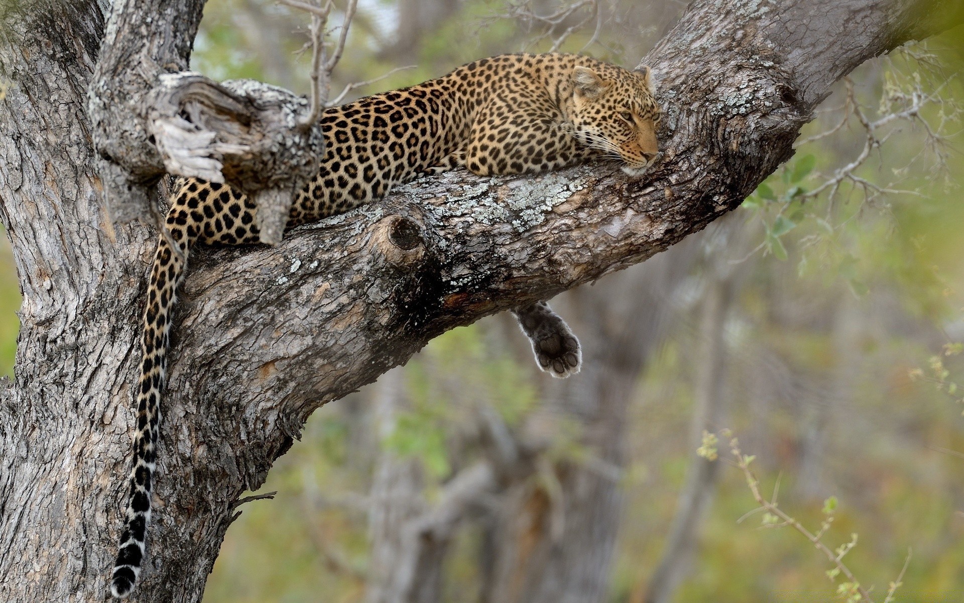 A leopard sleeps on a tree branch