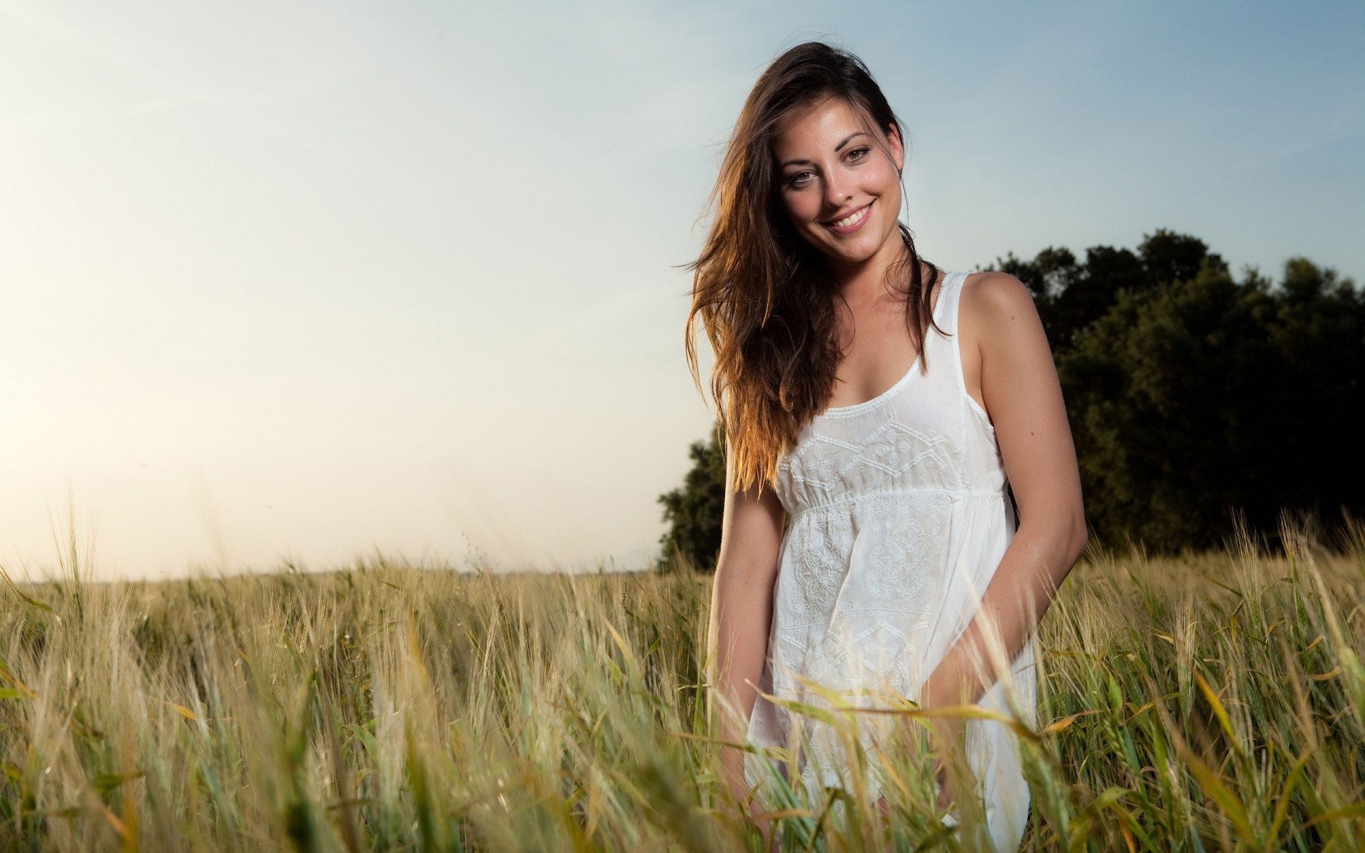 Beautiful girl with long hair in a white dress
