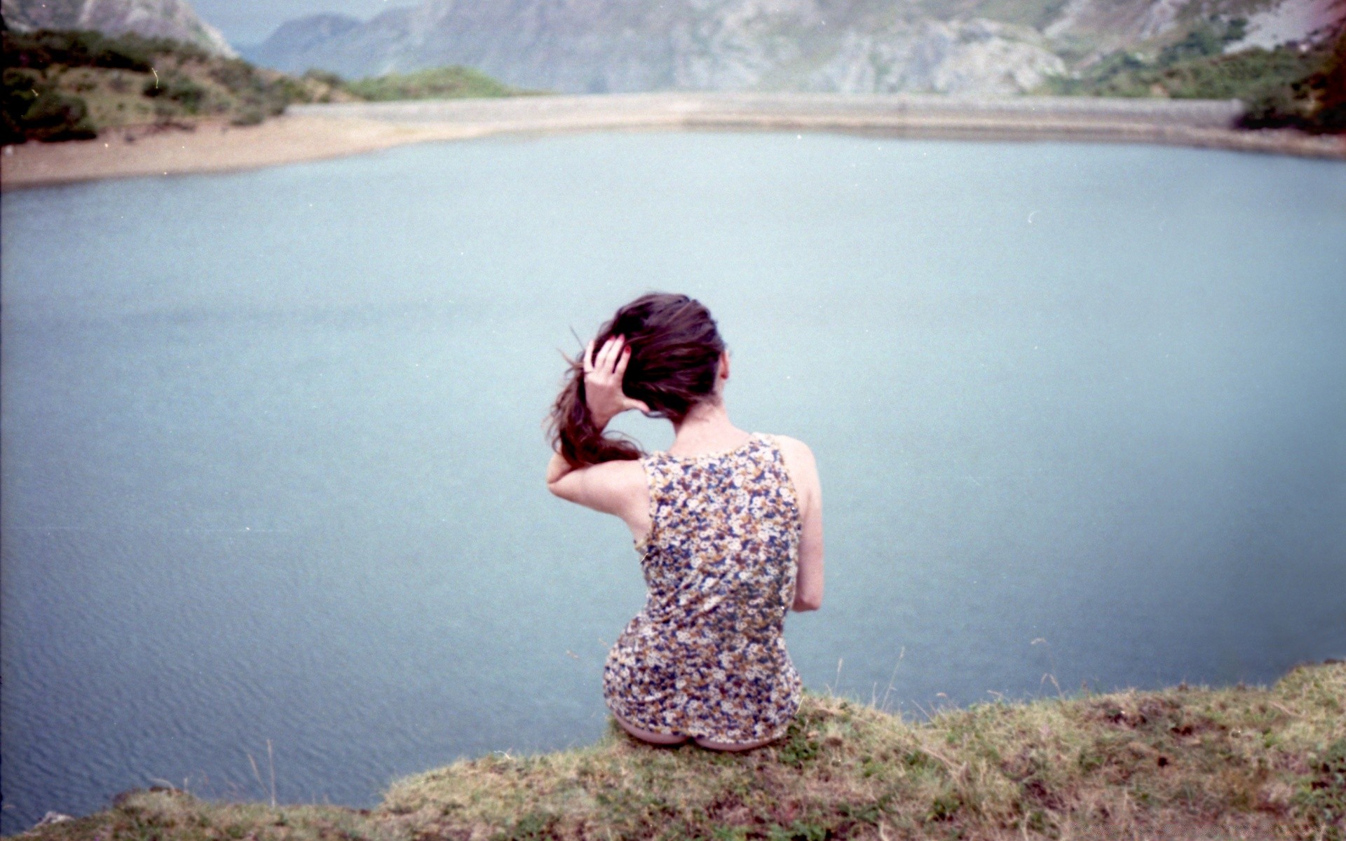 A girl is sitting on the shore of the lake