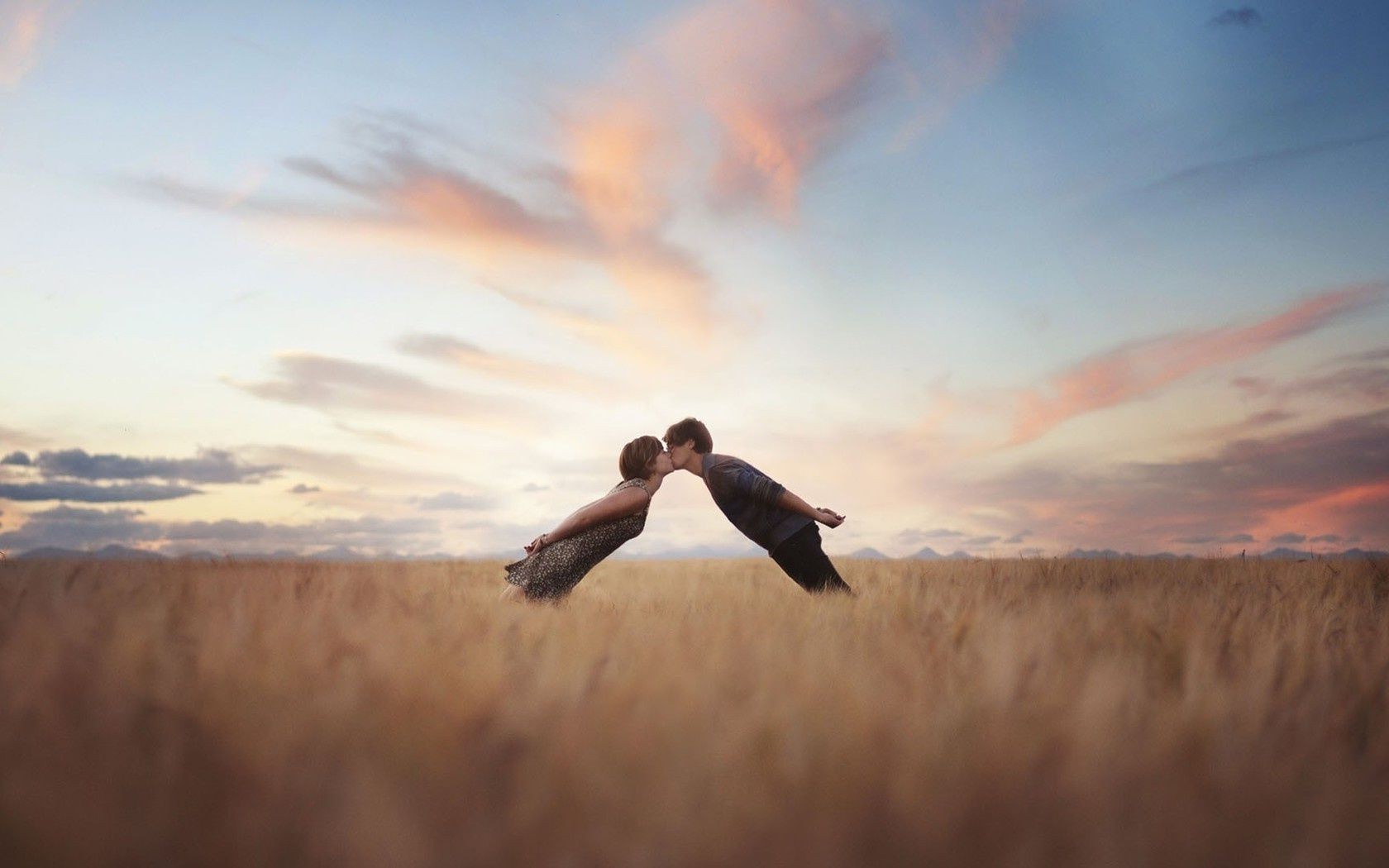 Couple kissing on the background of the field