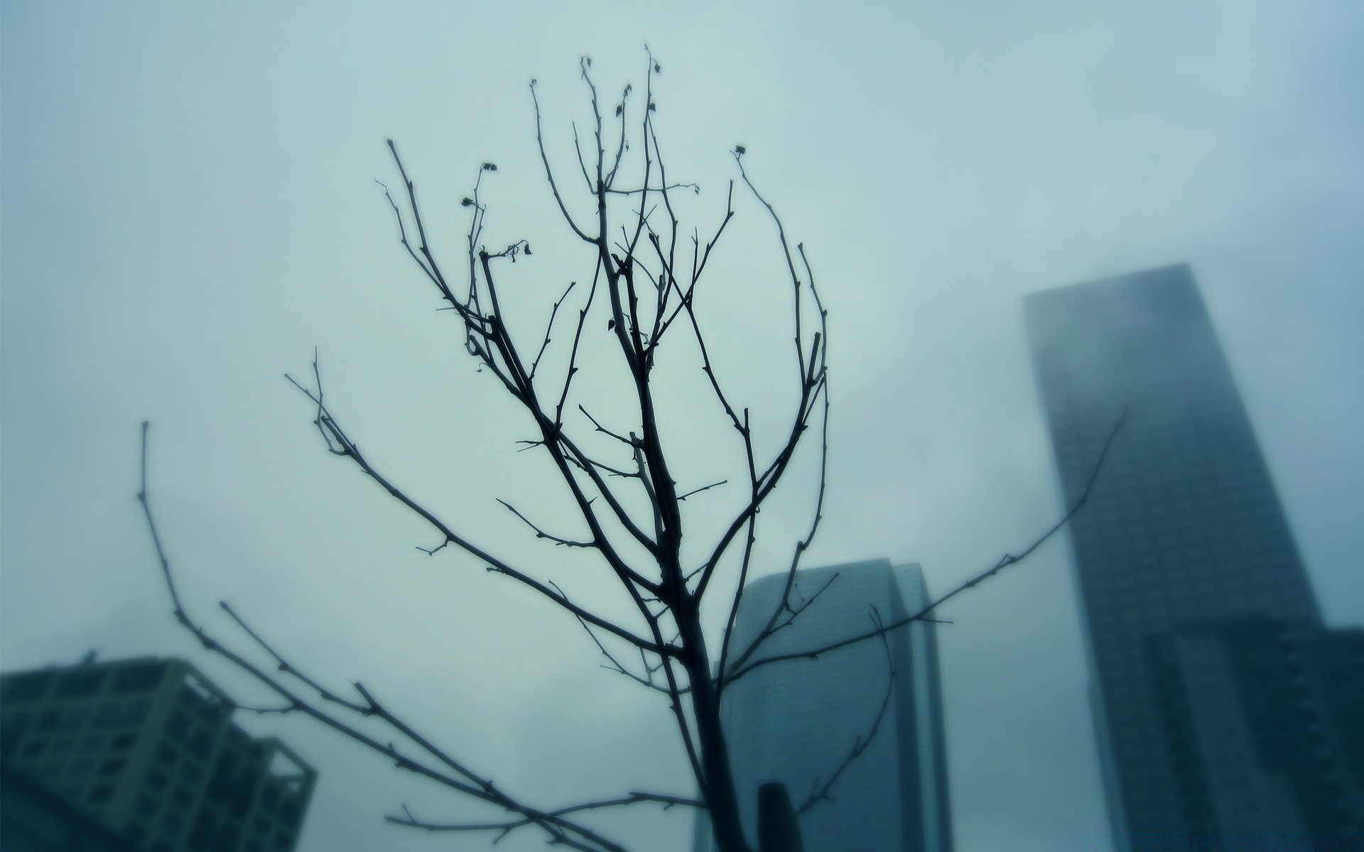 Skyscrapers on the background of a tree branch in a gray haze
