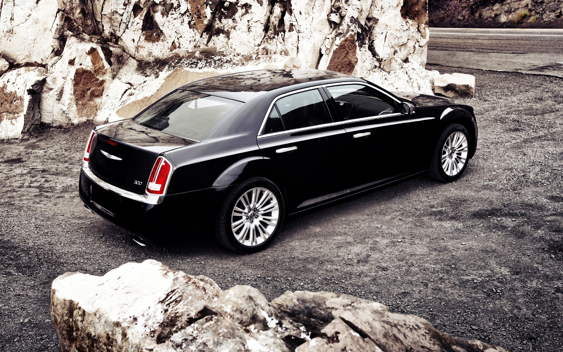 Black car on the road near the rocky wall