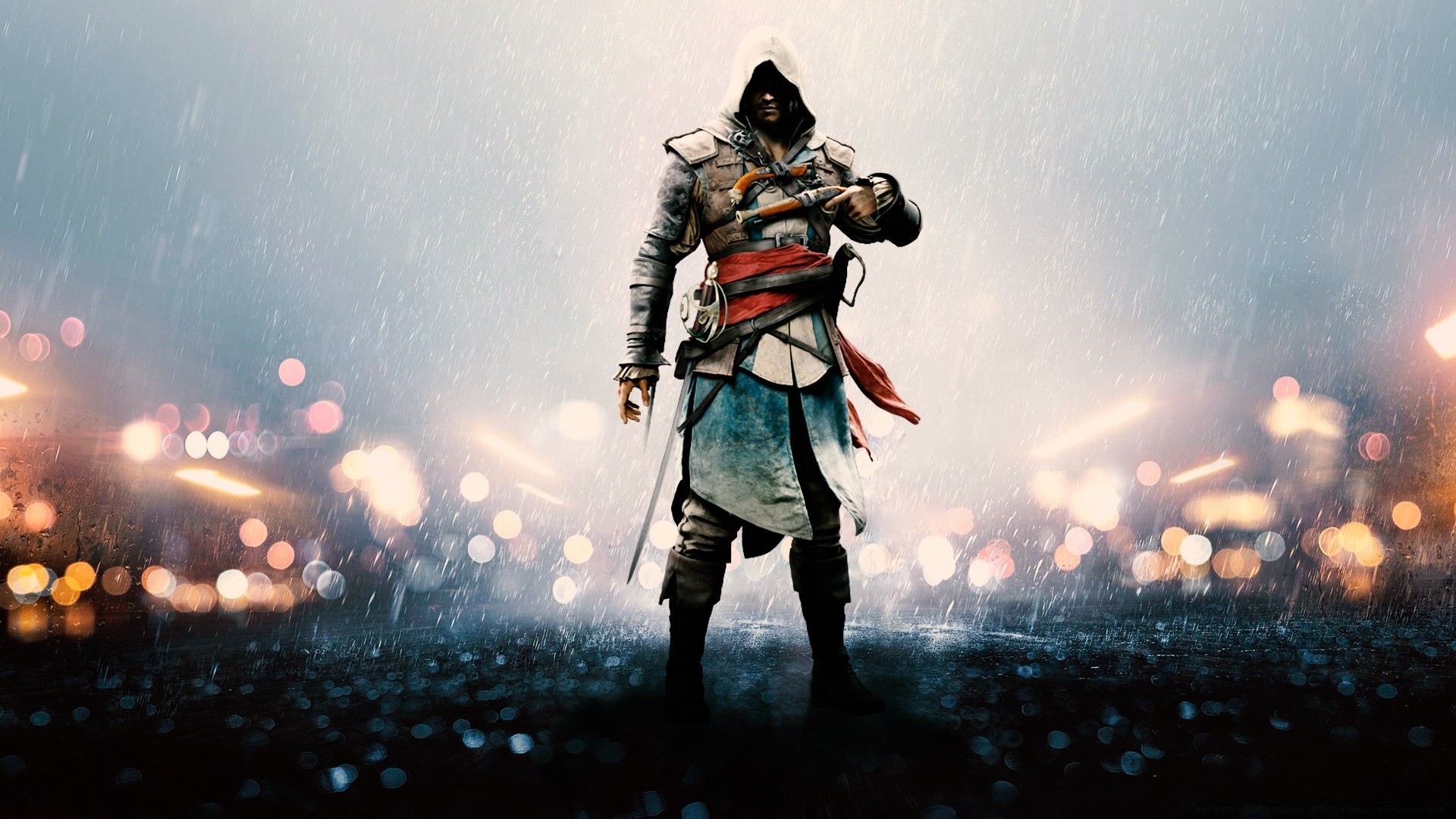 A man after a battle, lights around, it's raining