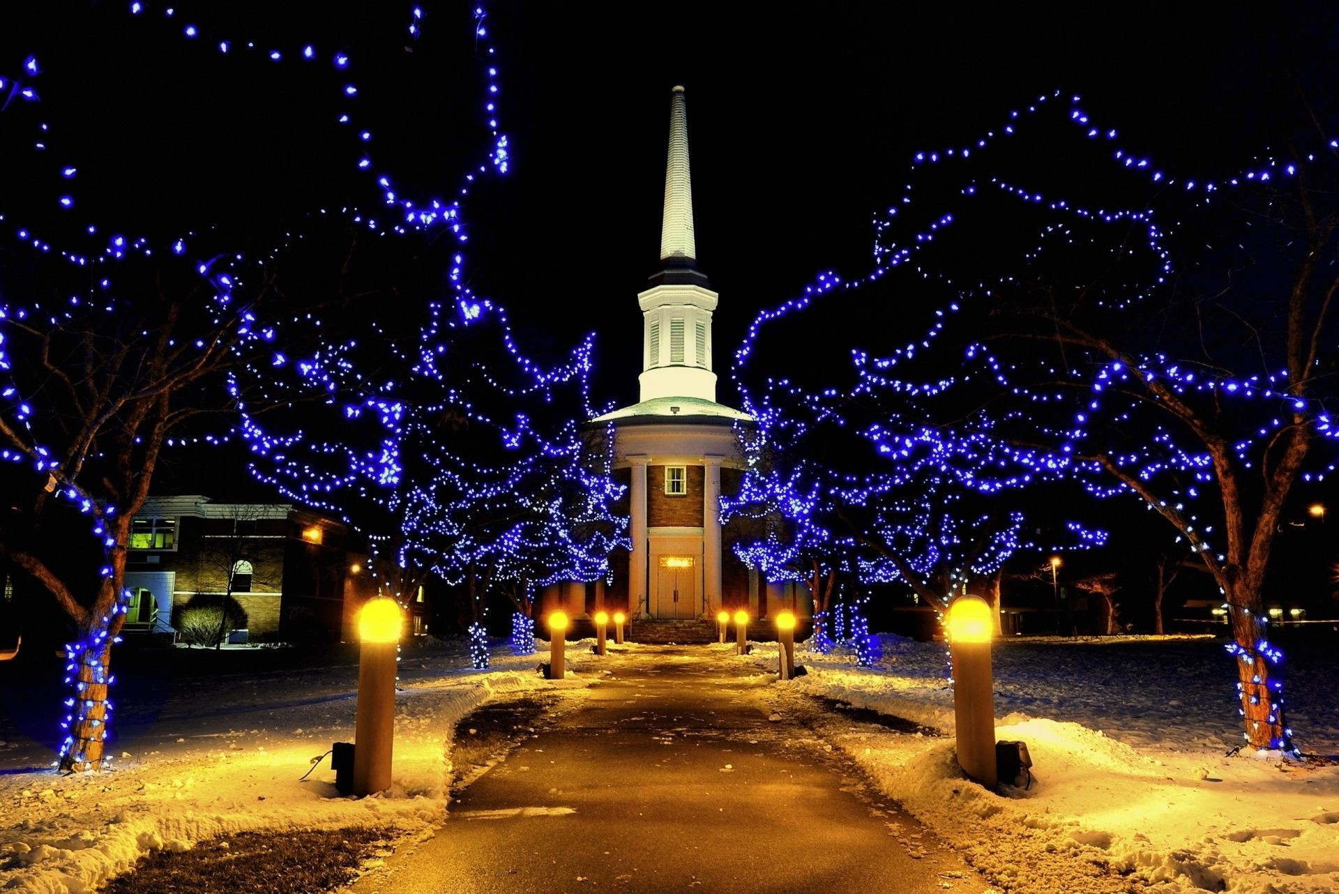 The inscription in English "merry Christmas" in the snow next to the blue balls