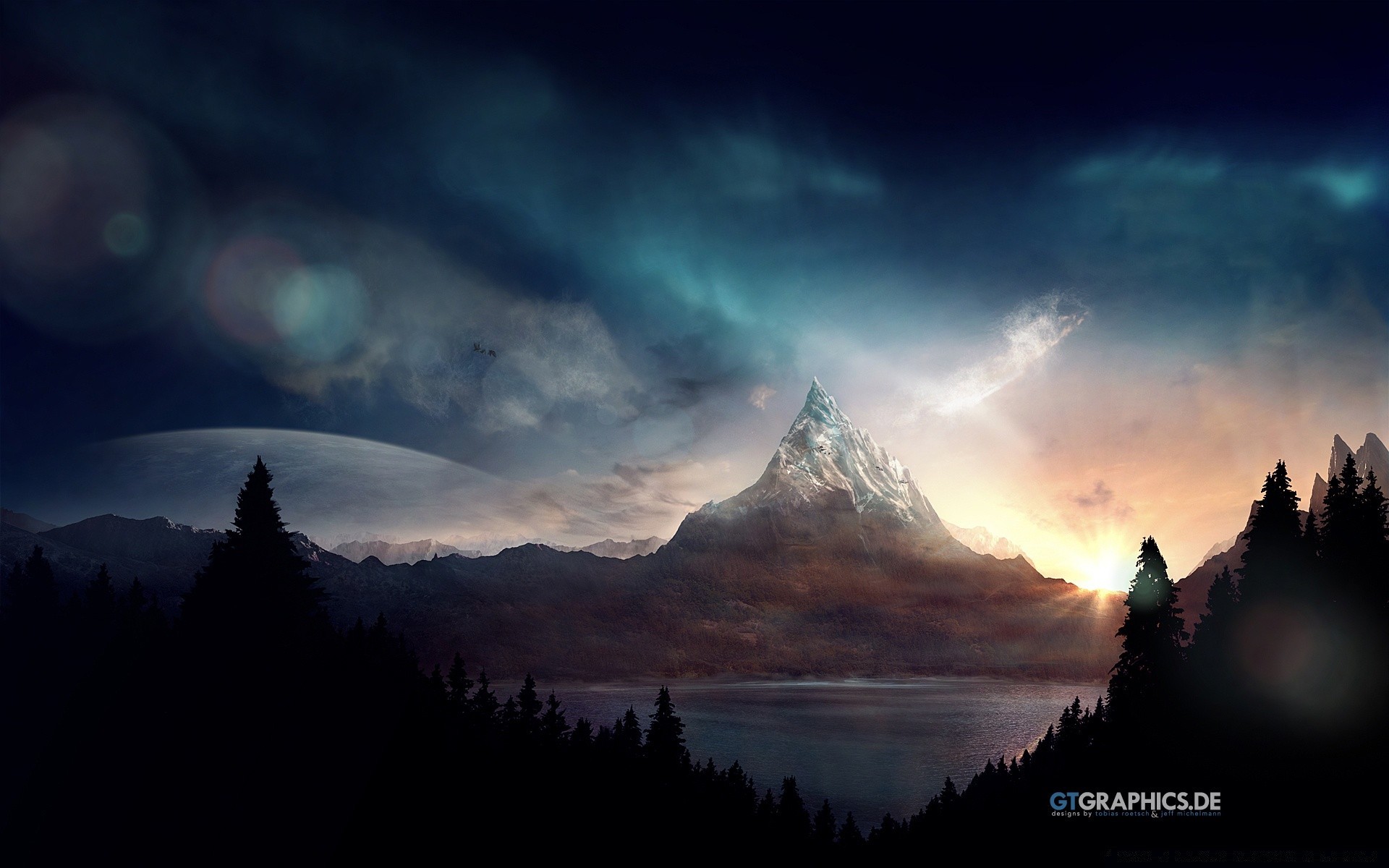Fantasy. Sunrise. Mountains. Sphere in the sky