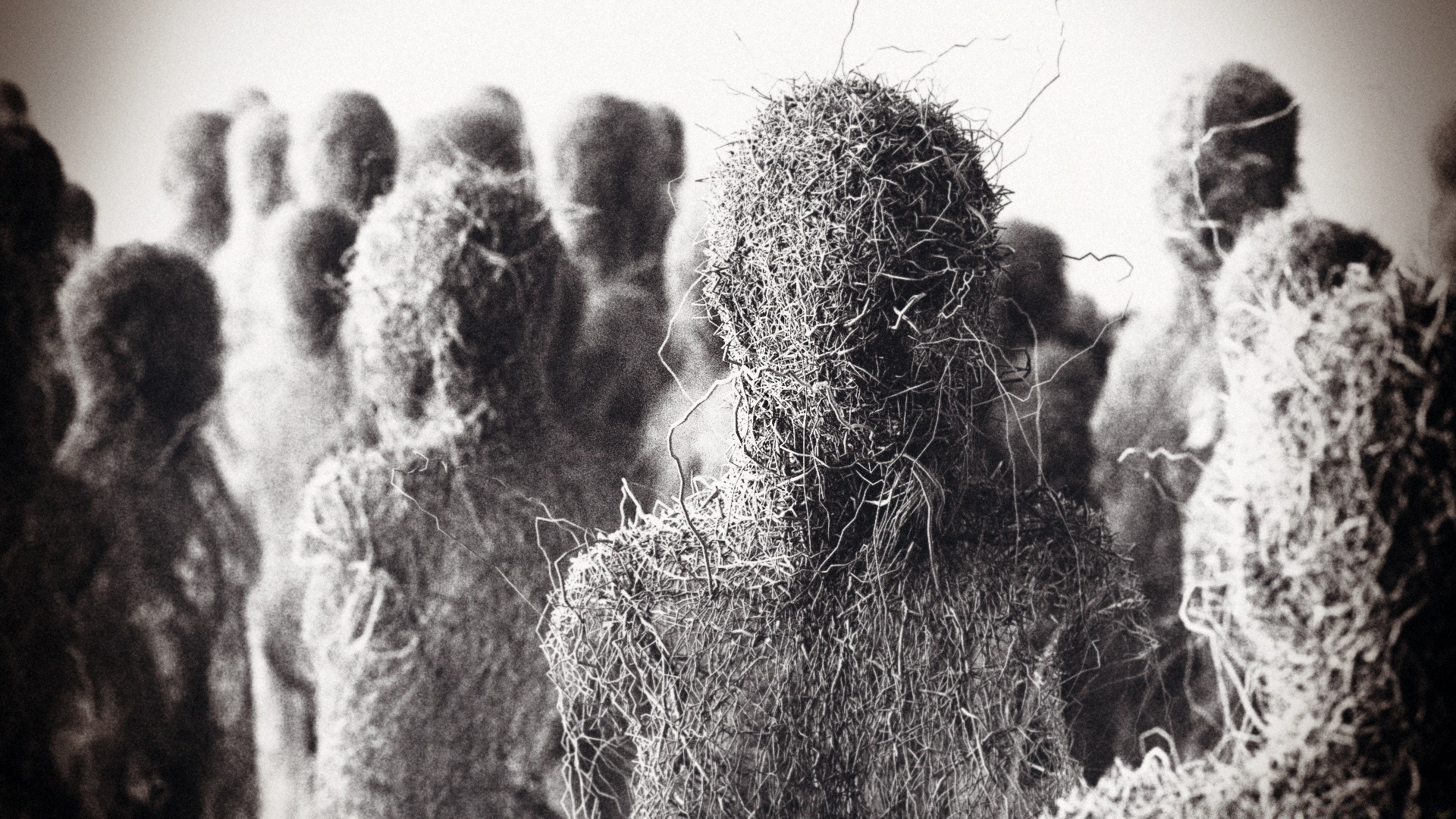 Cliffs with dry trees and suspension bridges, with balloons flying over them in a stormy sky