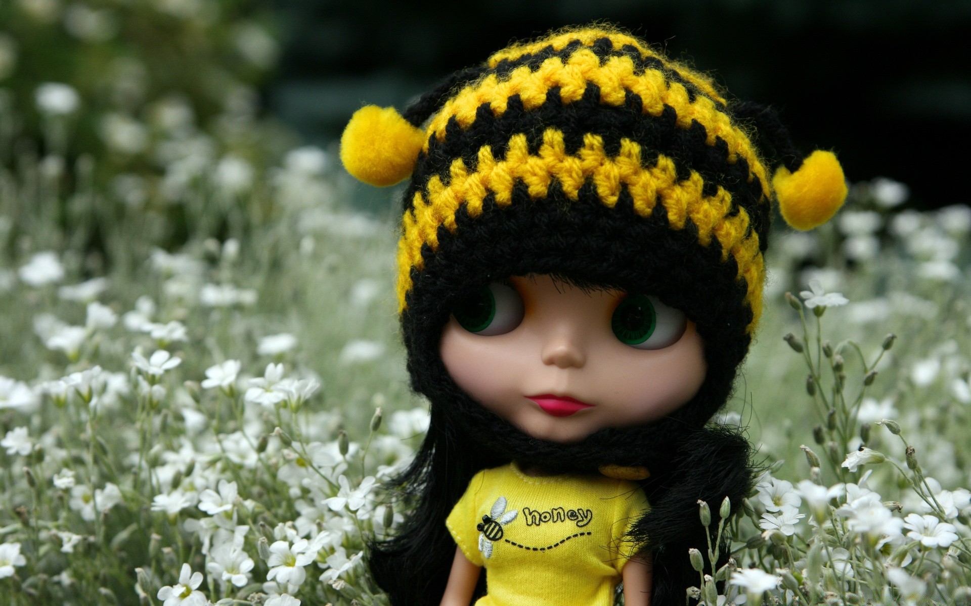 Doll in a hat in nature macro photography