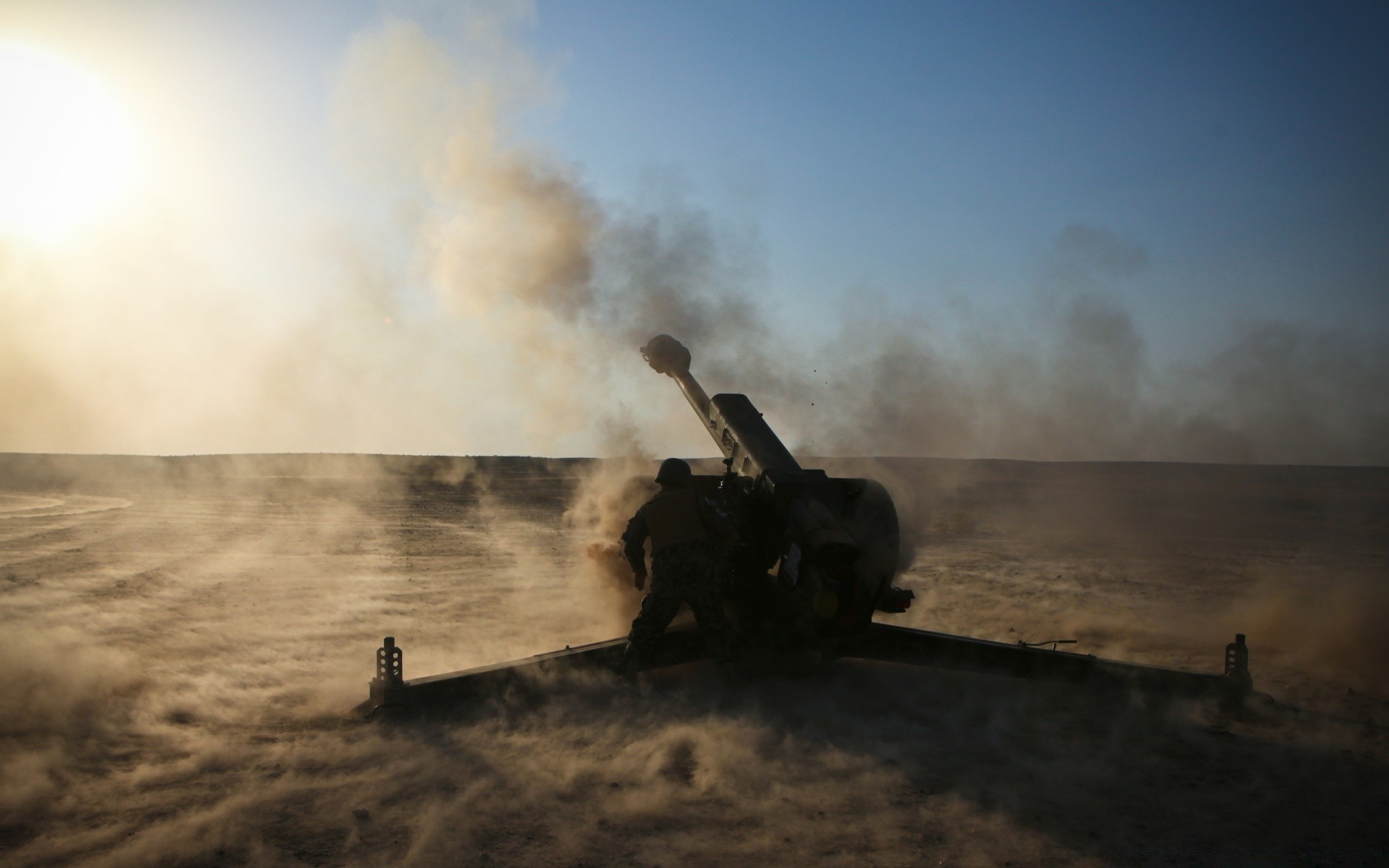 An artillery piece against a background of black smoke