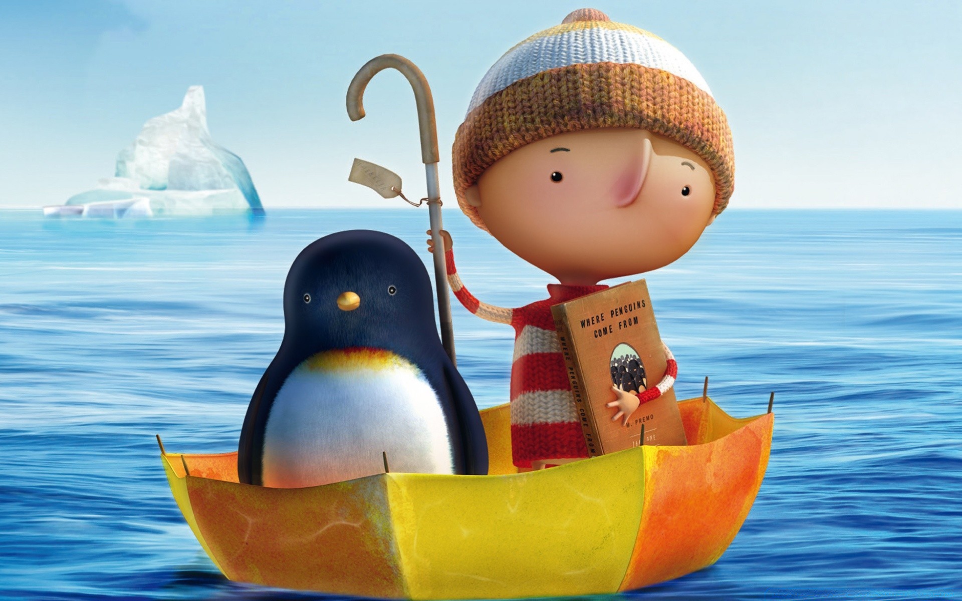 A boy and a penguin are floating on the sea in an umbrella