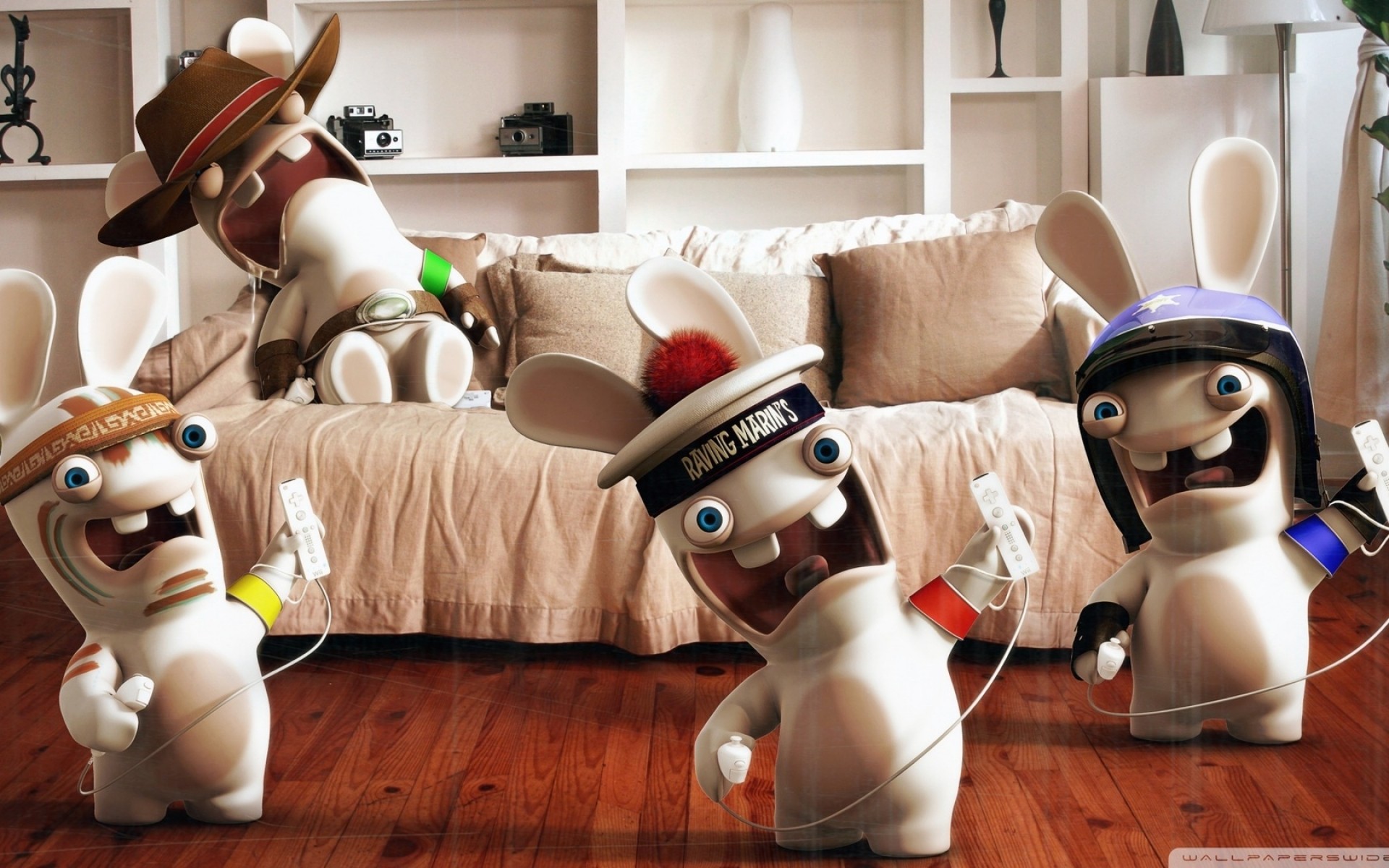Hares dance in the room by the sofa abstraction