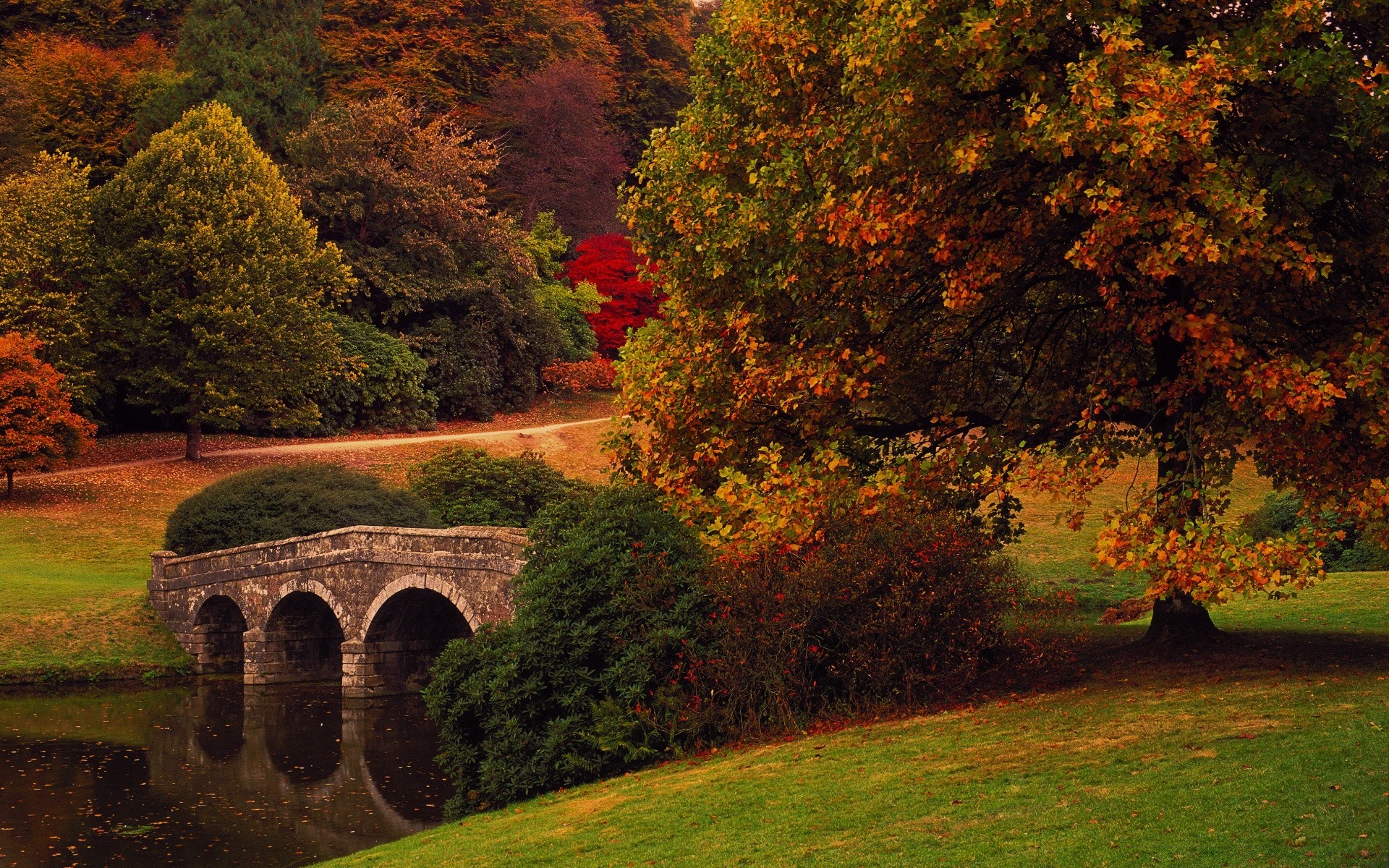 An old stone bridge over a river in the European hinterland, autumn landscape