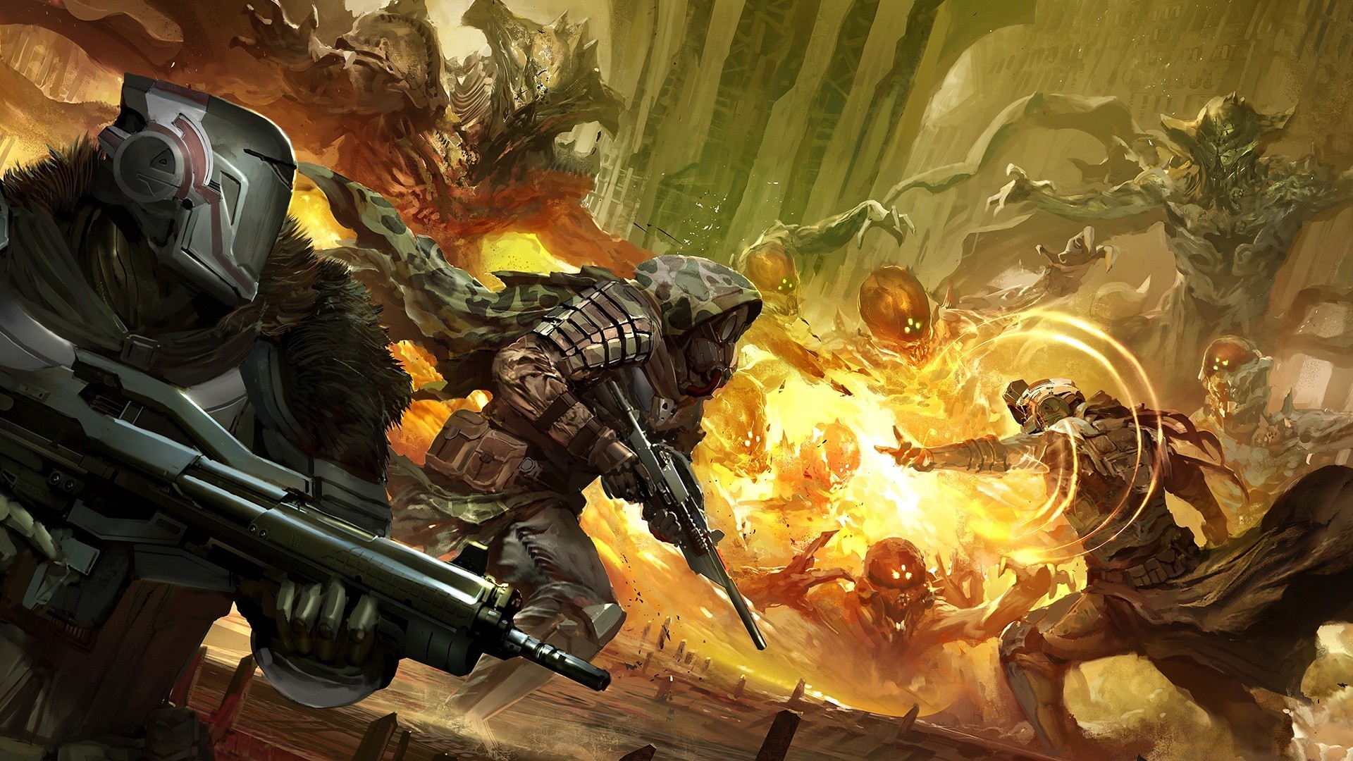 The hero of the game Farcry 4 in full combat gear stands on the high bank of the river knee-deep in the grass against the background of the sunset sky