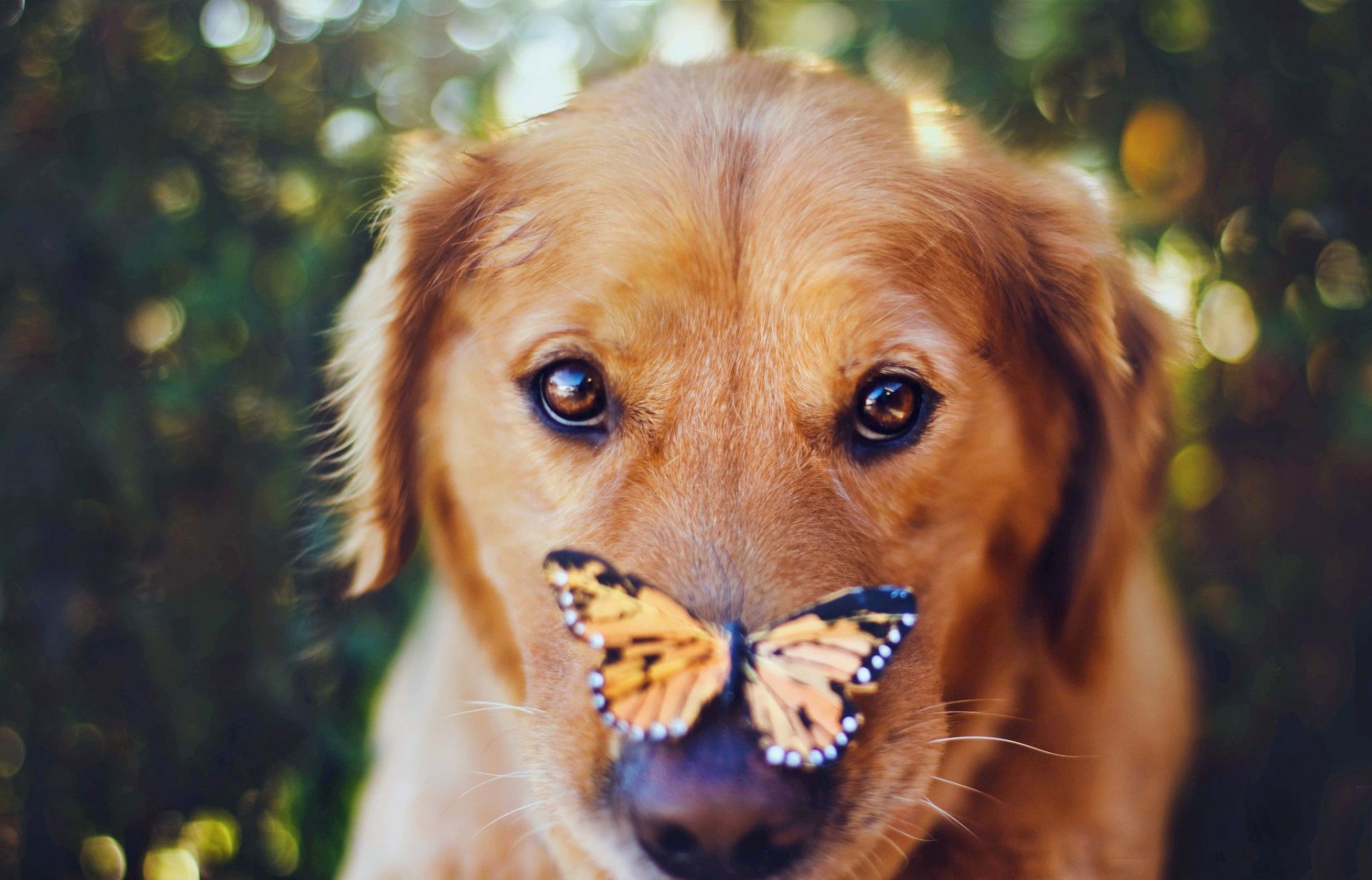 Cute puppy dressed as an Easter bunny in a basket with painted eggs. Easter