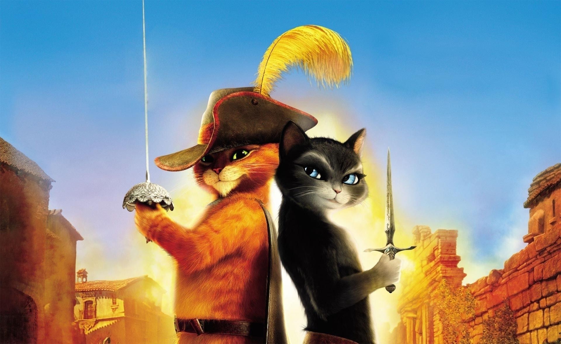 Cartoon characters Puss in Boots. A hat with a feather and a sword