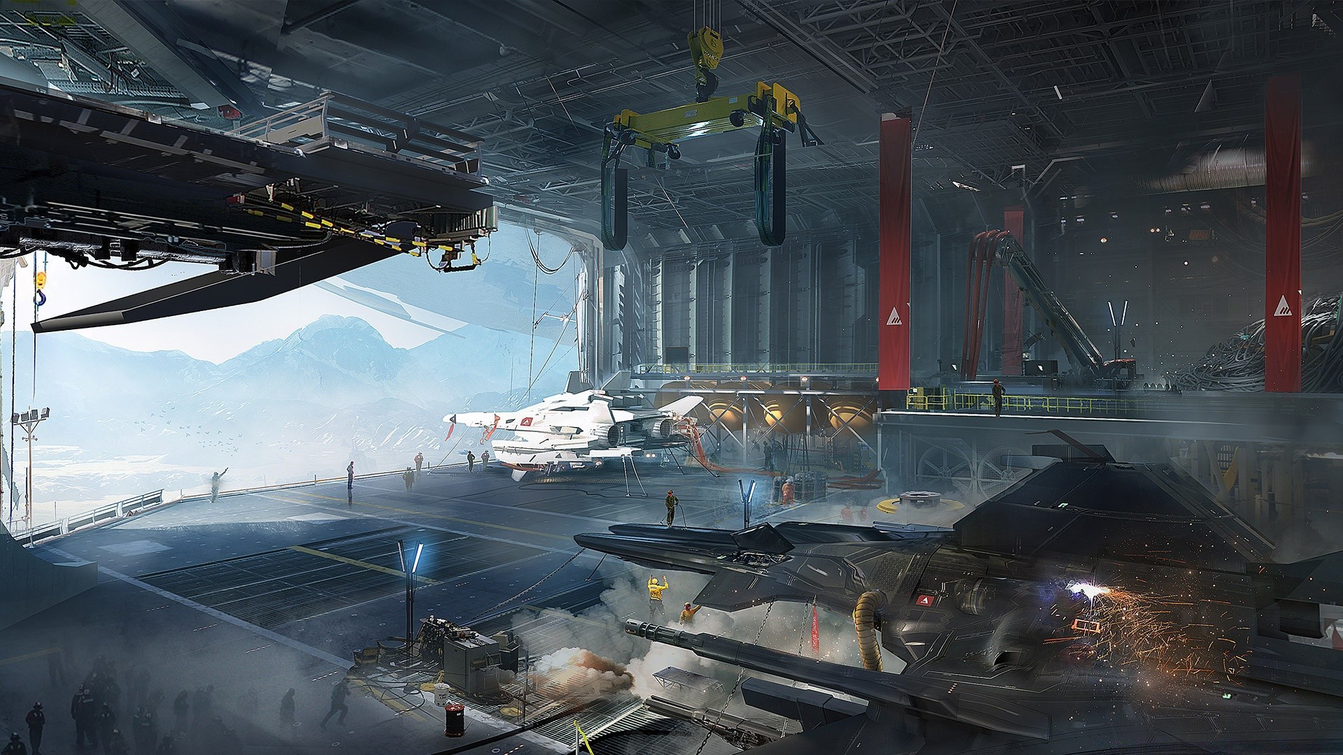 Planes in a big dark hangar