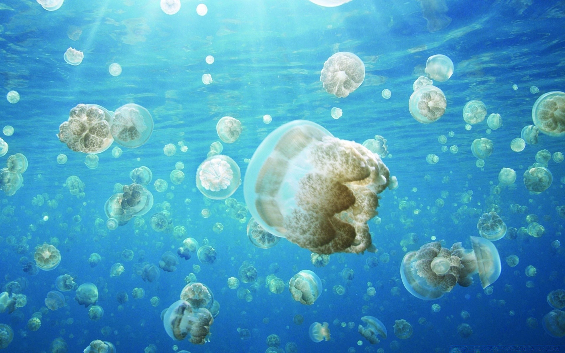 A lot of transparent jellyfish under water