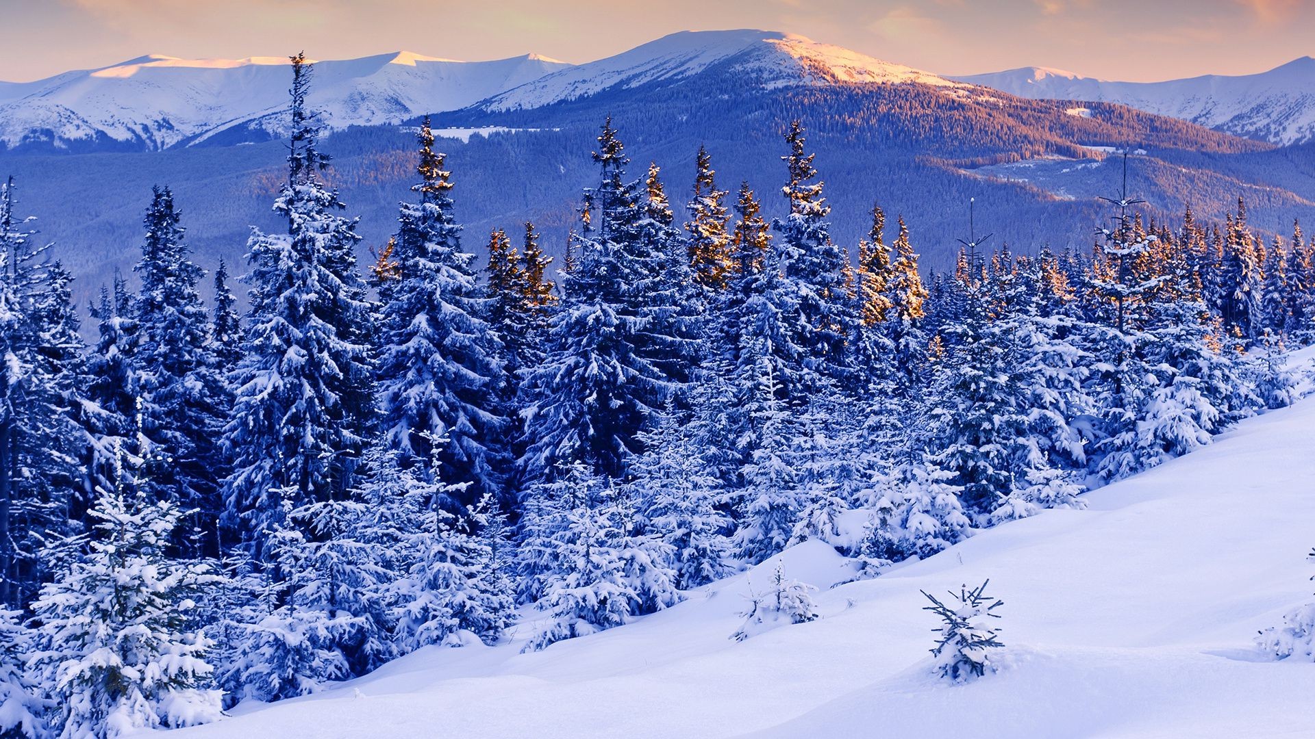 Snowy mountains and winter forest