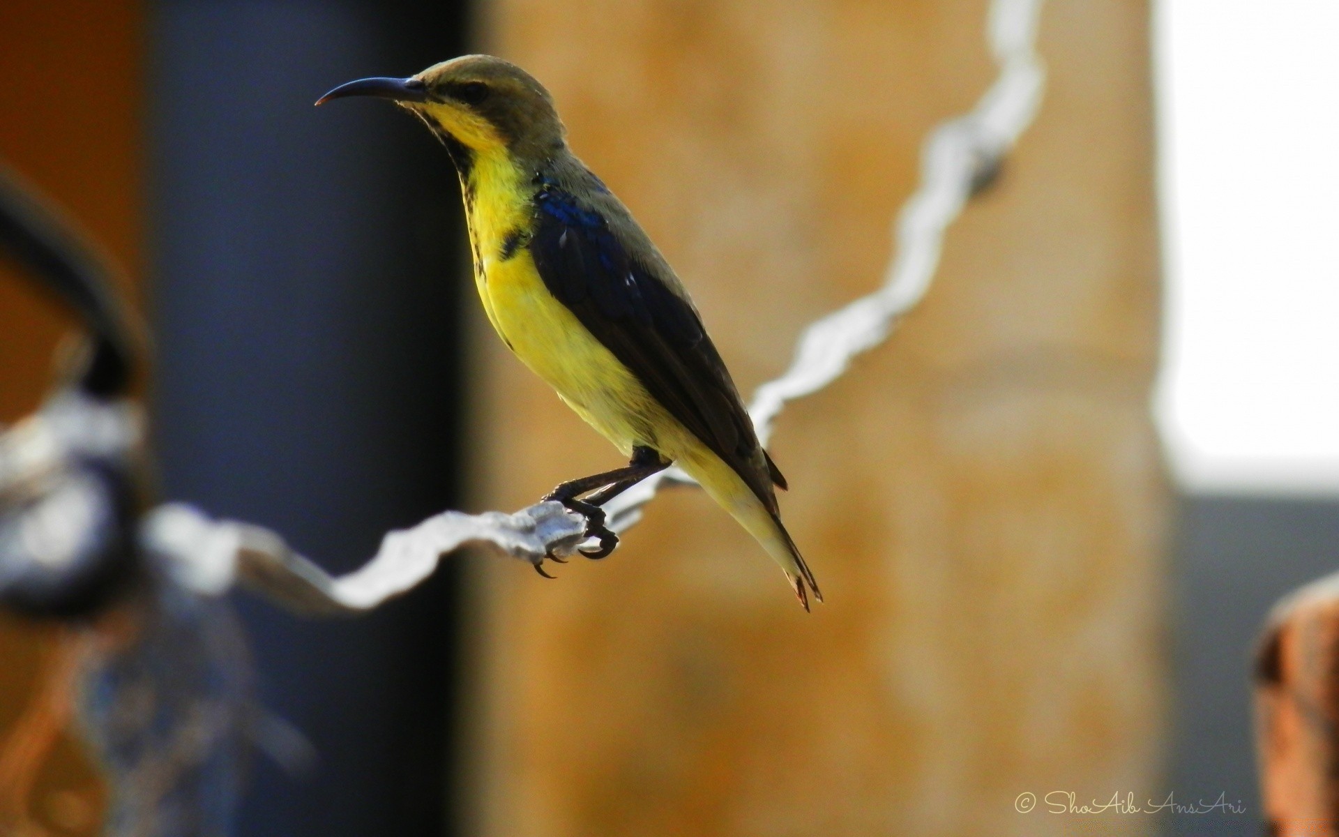 Frosty day. A bird with a yellow tie is sitting on a branch