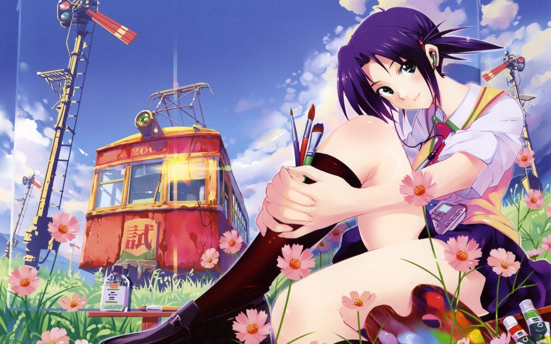 An anime heroine sitting in the grass among flowers, with brushes, palette and paints, next to a red tram