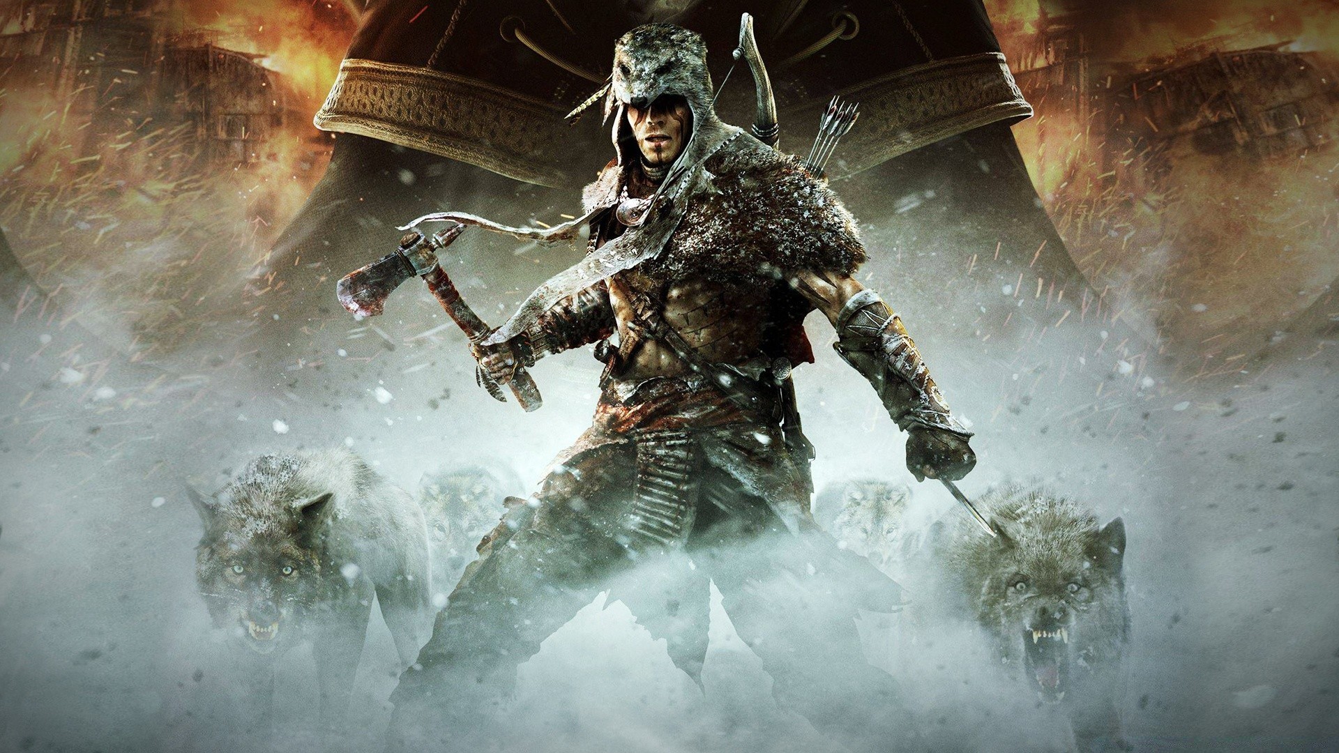 A warrior with an axe and a revolver on the background of the American flag from the game assassin's creed