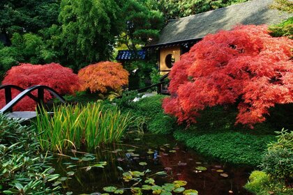 A small house with a pond in front of it and surrounded by autumn shrubs