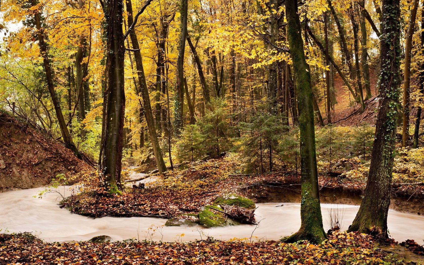 A small waterfall with autumn leaves