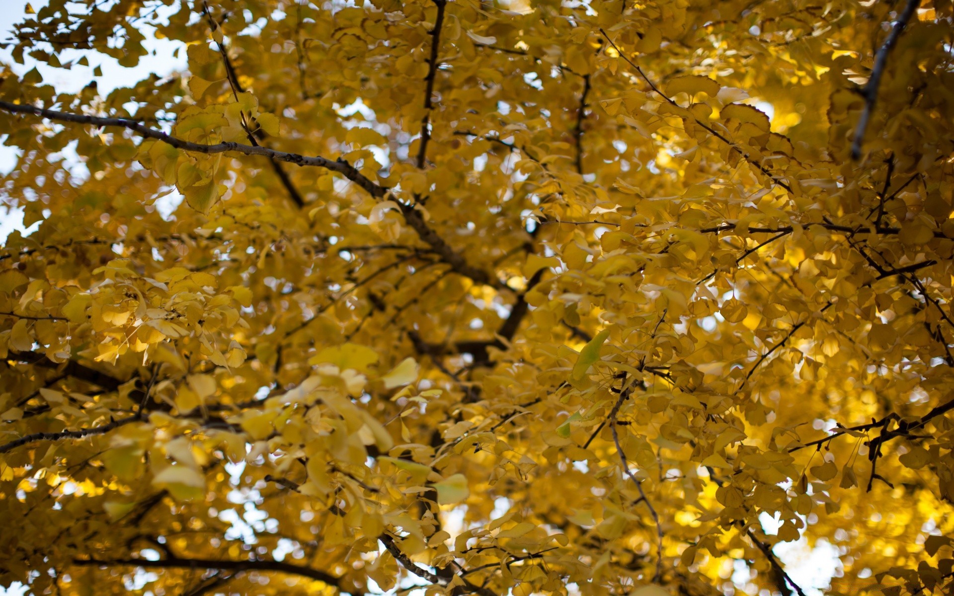 A wooden bench stands in an autumn forest among fallen yellow leavesA wooden bench stands in an autumn forest among fallen yellow leaves