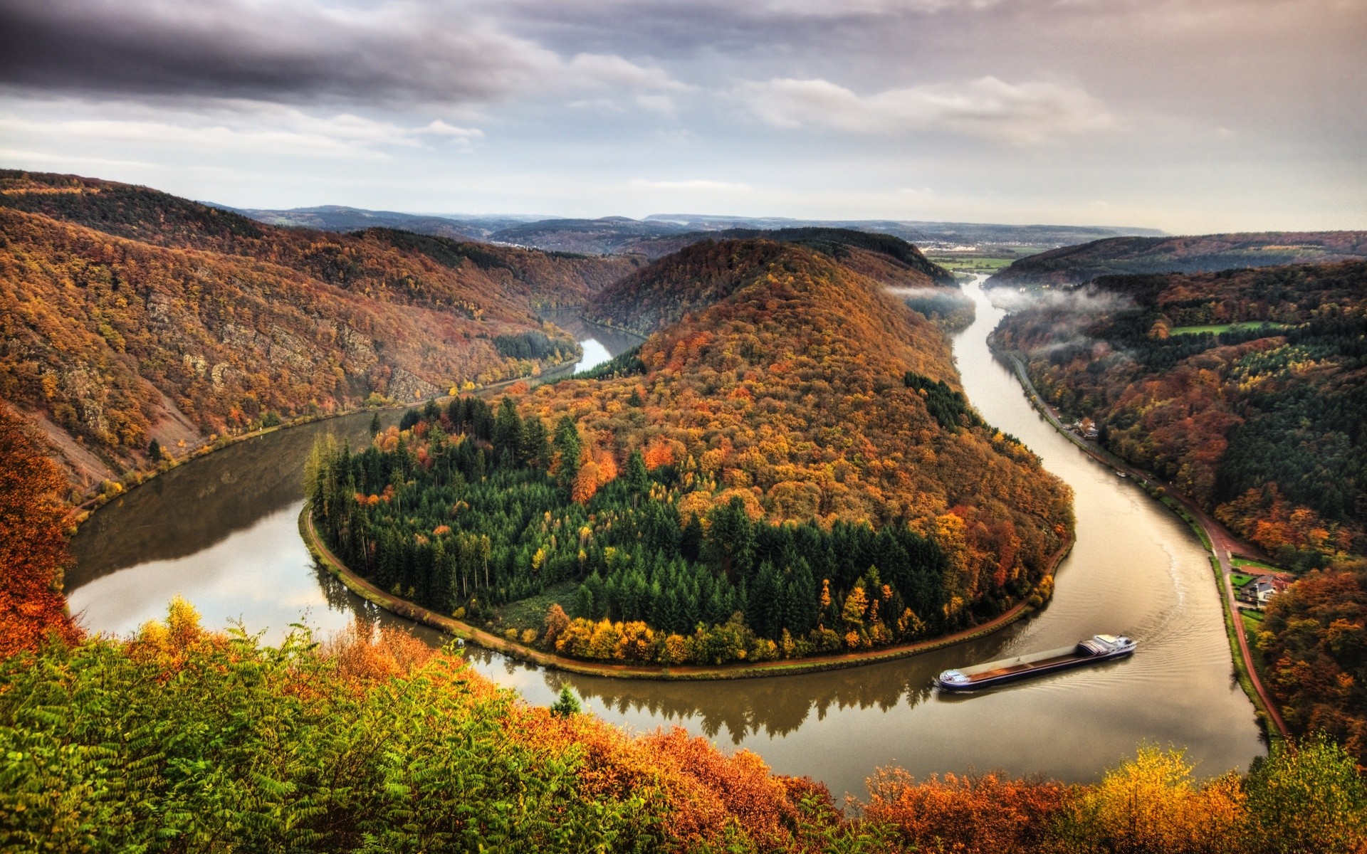 Autumn; a man rides a bicycle, an autumn leaf sprinkled the road