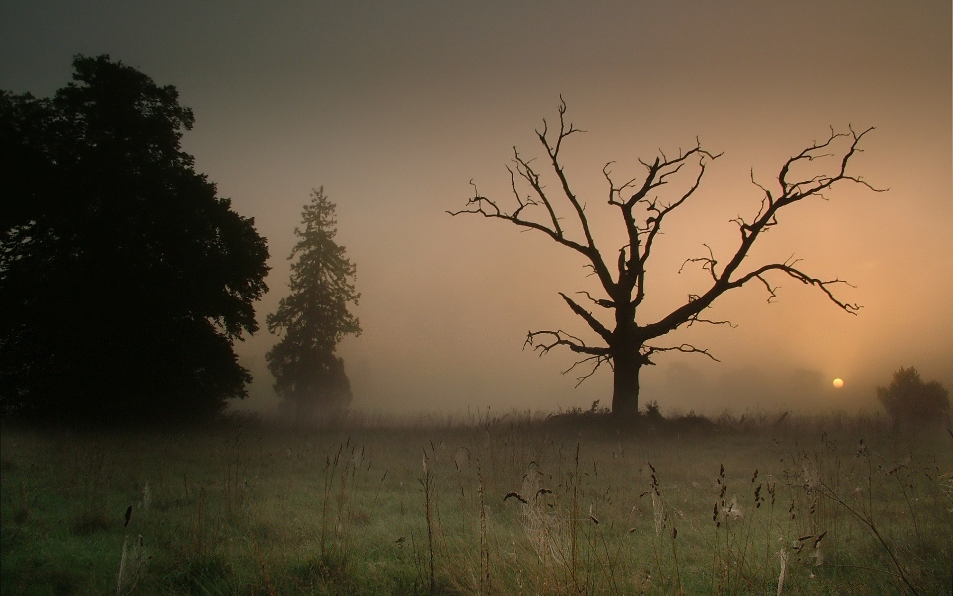Sunset, fog and a tree as a symbol of farewell