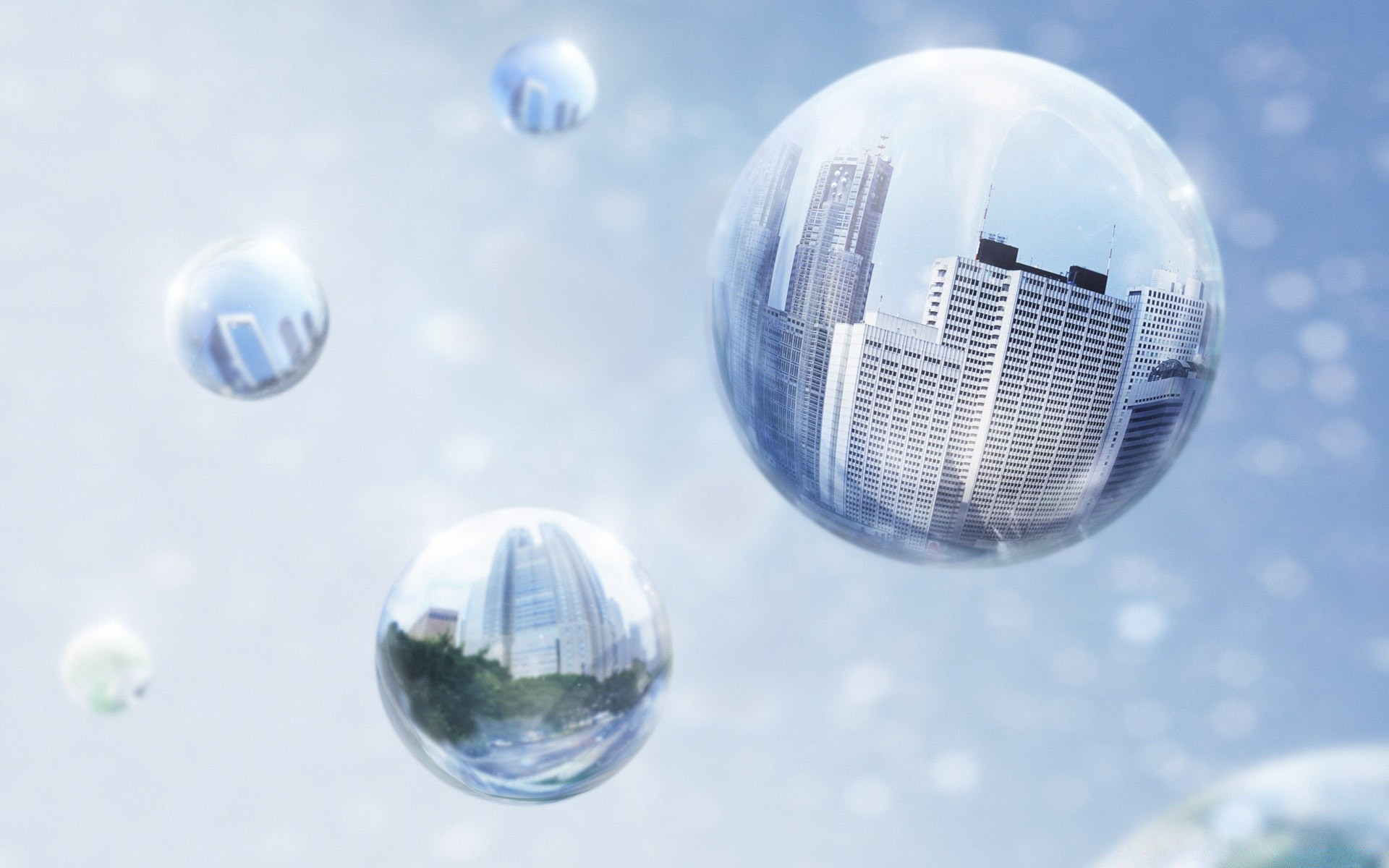2 Christmas blue balls on white ribbons on a blue background with white snowflakes of different sizes