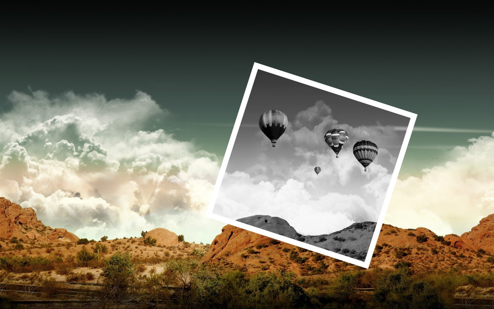 Retro balloons in black and white photo on the background of mountainsRetro balloons in black and white photo on the background of mountains