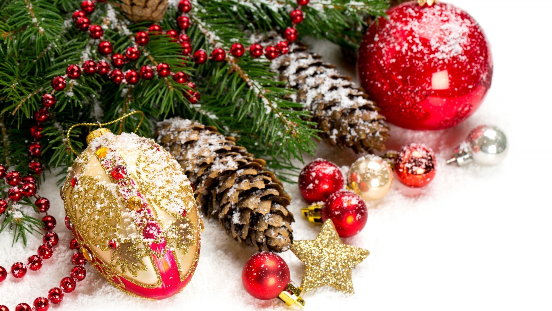 Christmas tree toys and cones on a branch in the snow