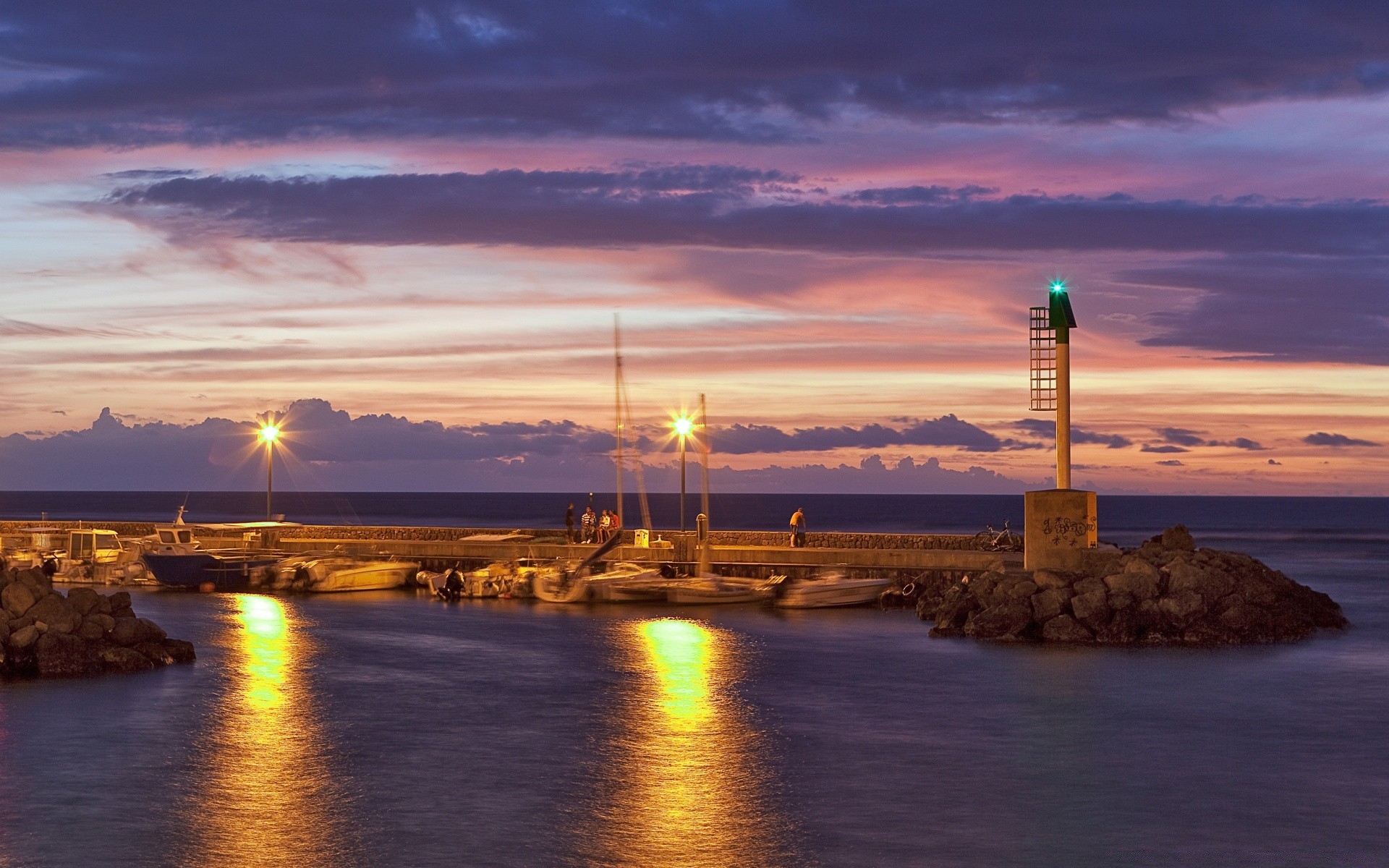 Sea bay at sunset, twilight, rocky shore, lights of the night resort town
