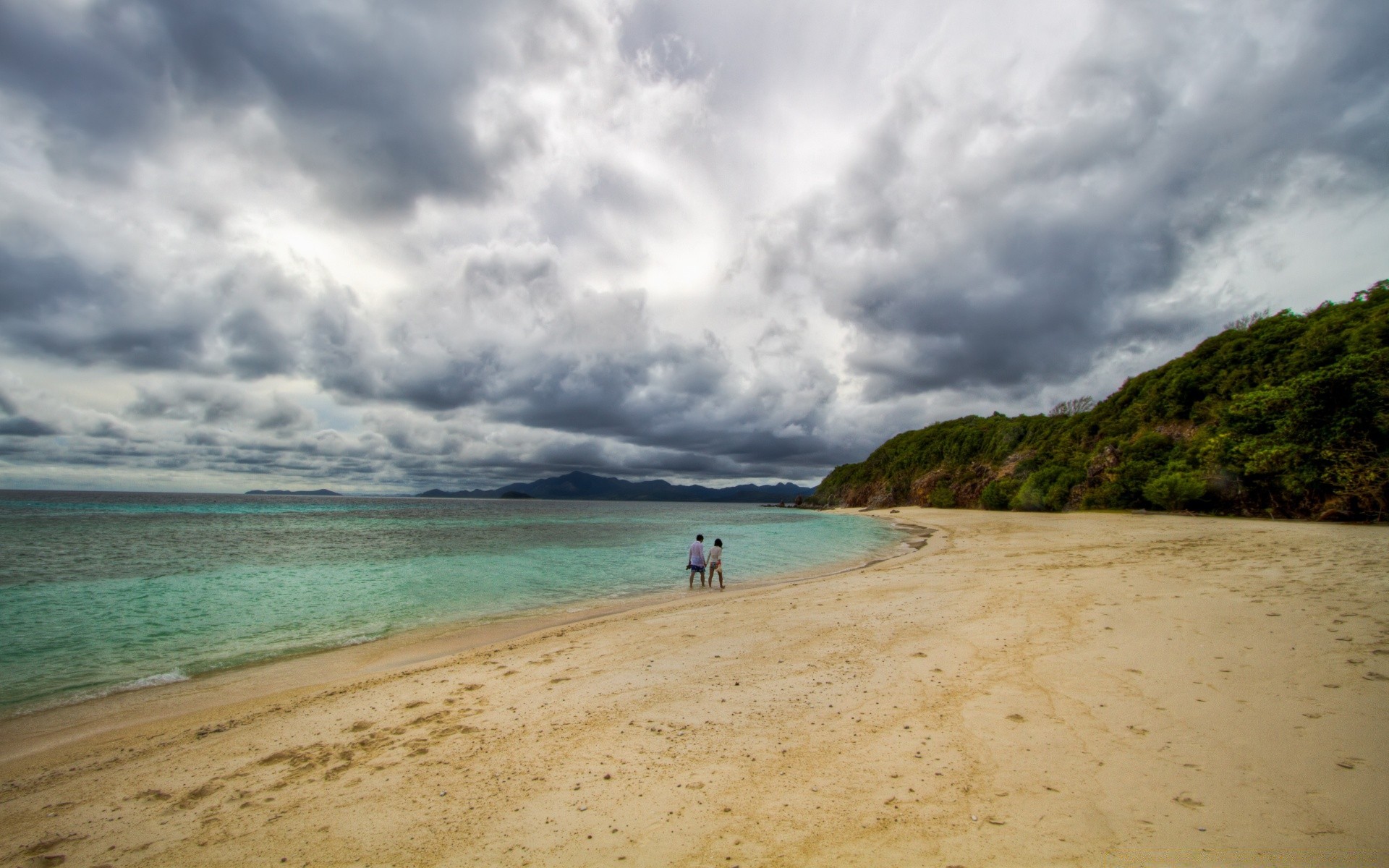 Two people walking on a wild beach