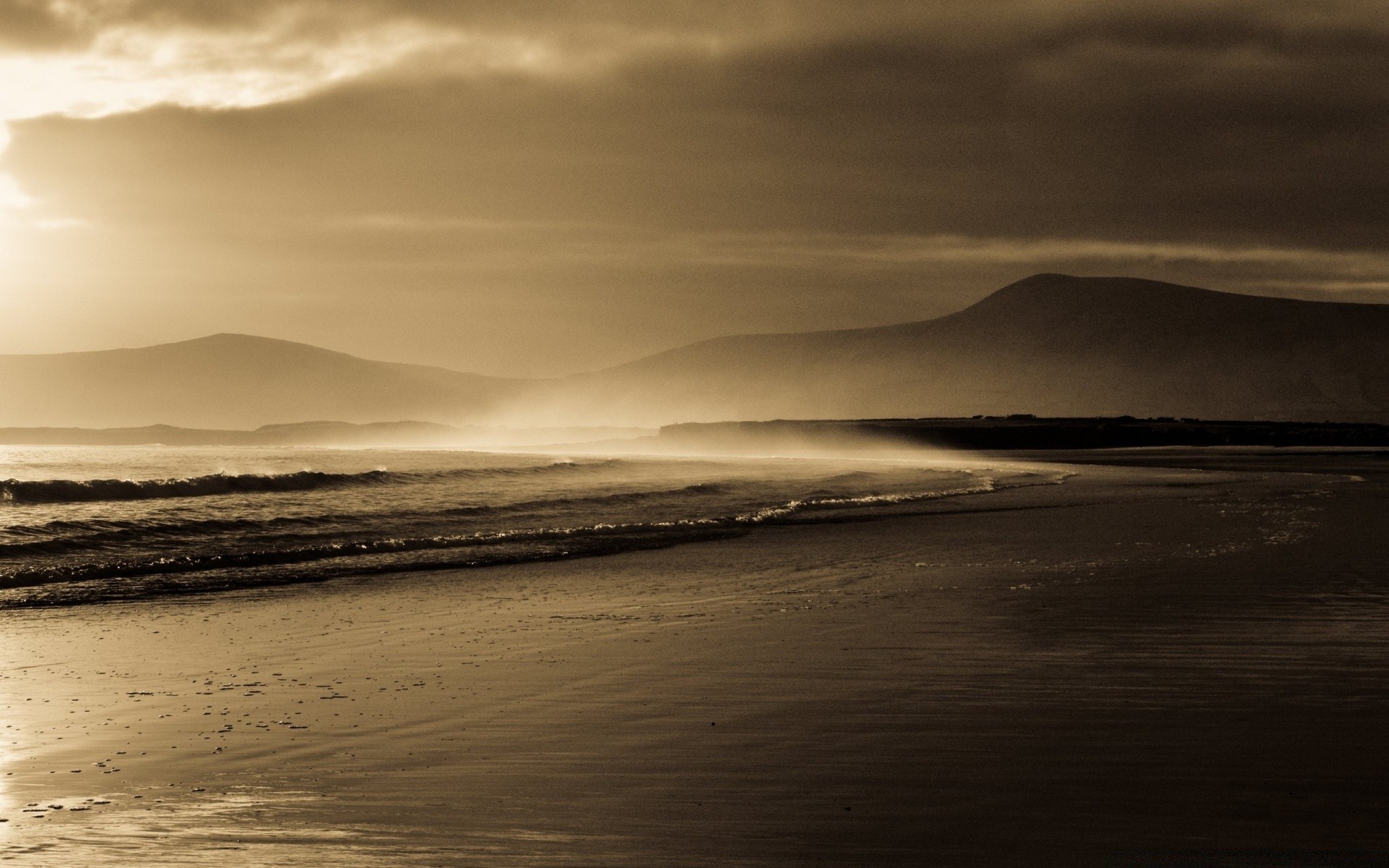 Ocean beach at sunset with sand in yellow colors