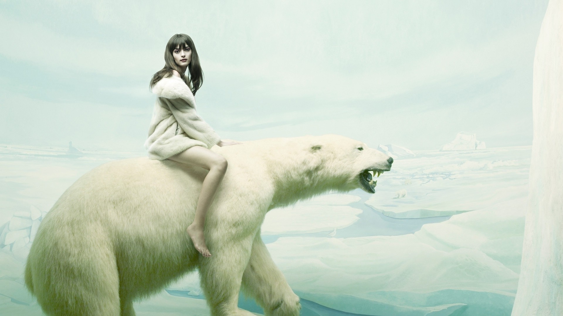 A girl is sitting on a polar bear