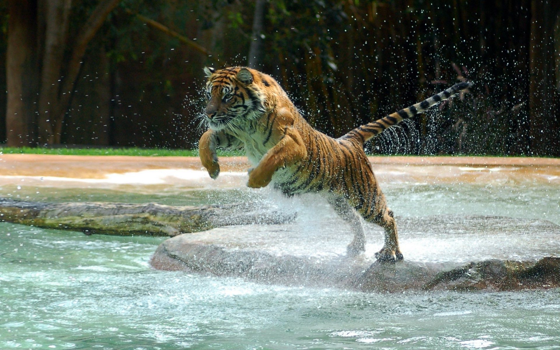 Wildlife with a tiger jumping over the water