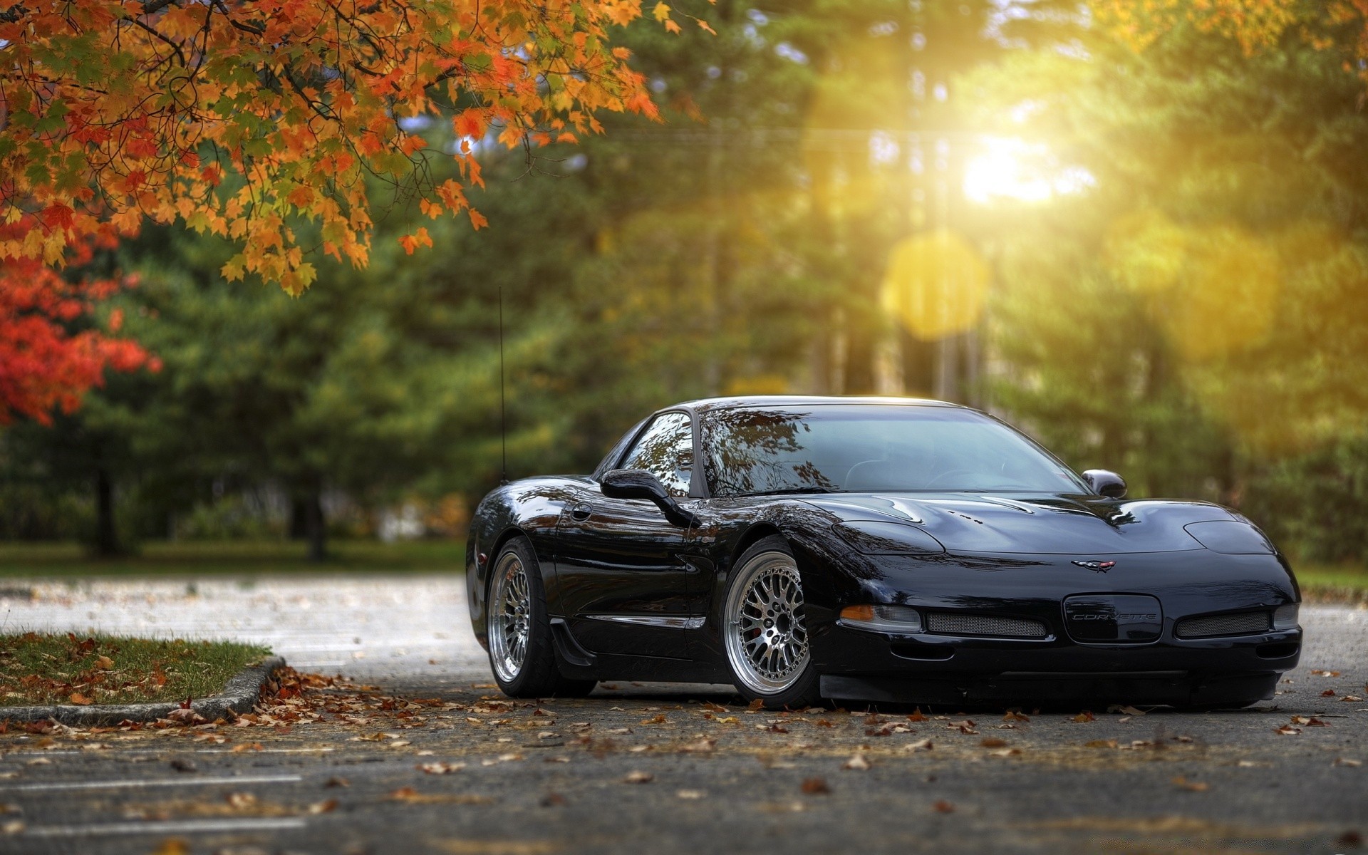 Black car on the background of autumn trees