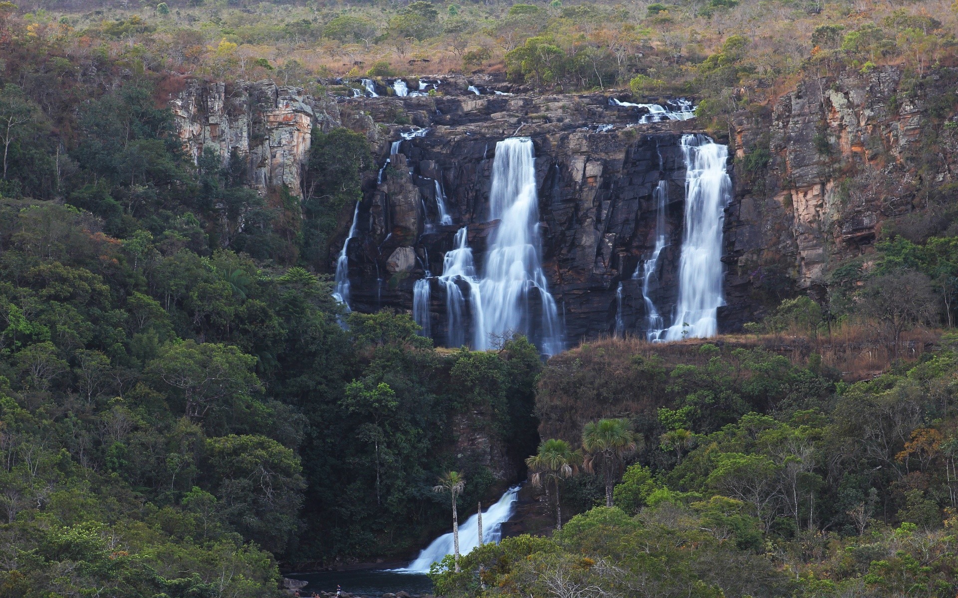 The thin streams of the waterfall wash the trees on the mountainsideThe thin streams of the waterfall wash the trees on the mountainside