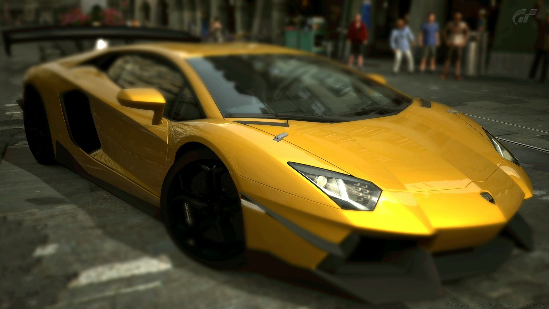 Yellow Ferrari racing car in an ancient city in the gran turismo computer game