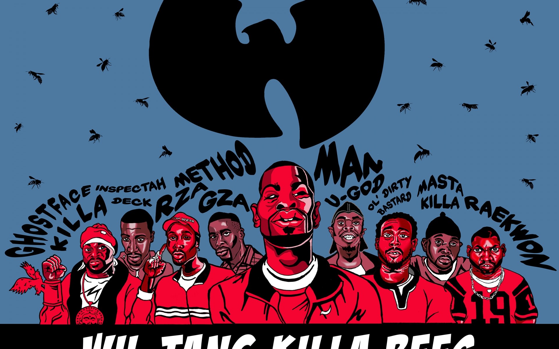 Illustration in red on blue of a musical group