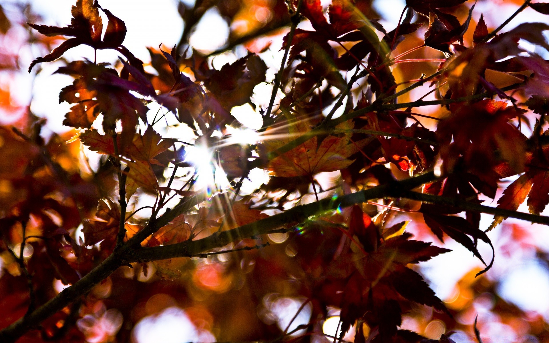 The rays of the sun break through the branches of trees with autumn leaves