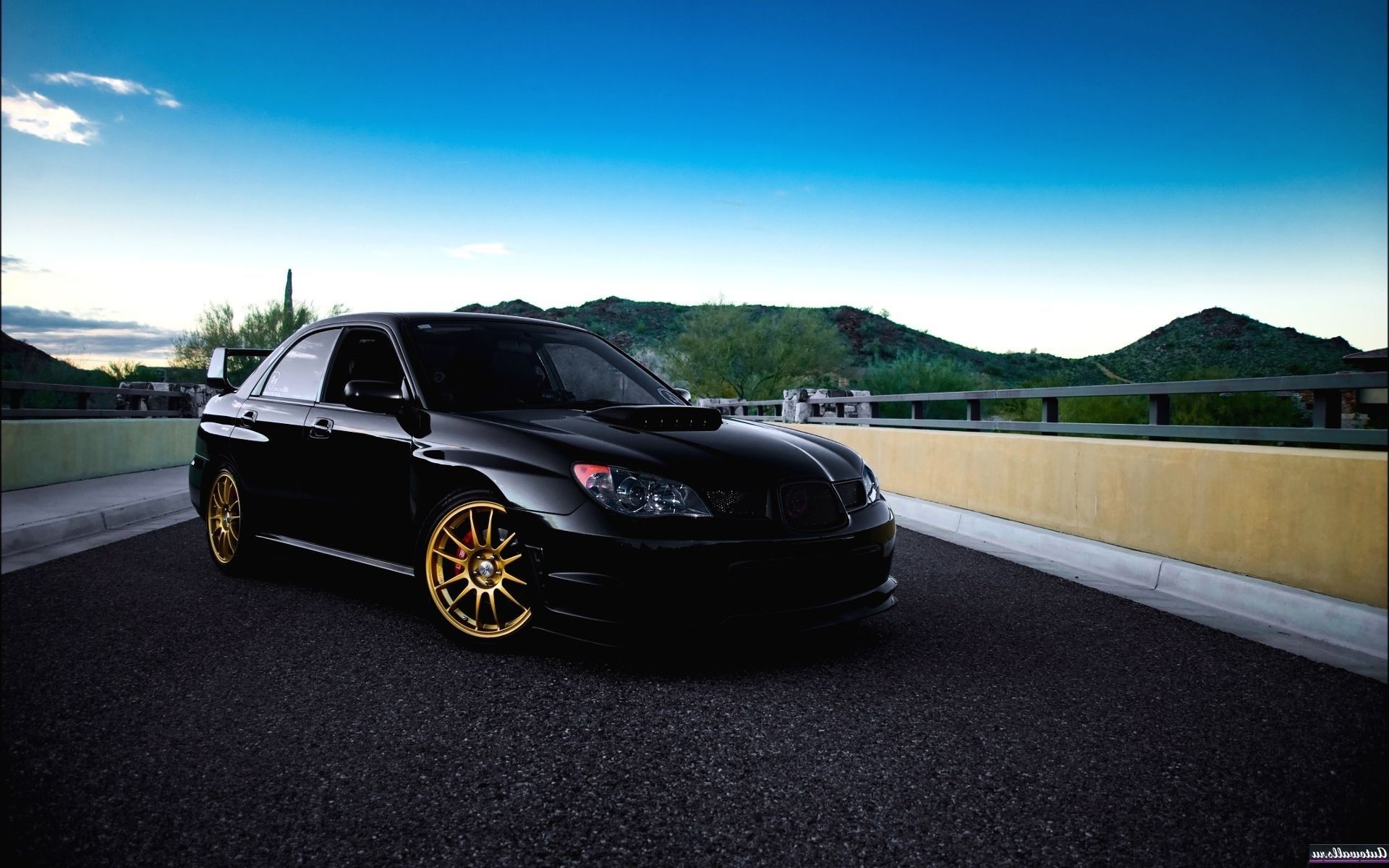 Sports car on asphalt at sunset