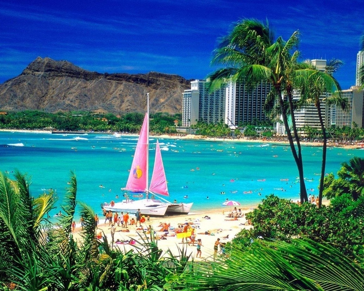 Beach and pink yacht sails