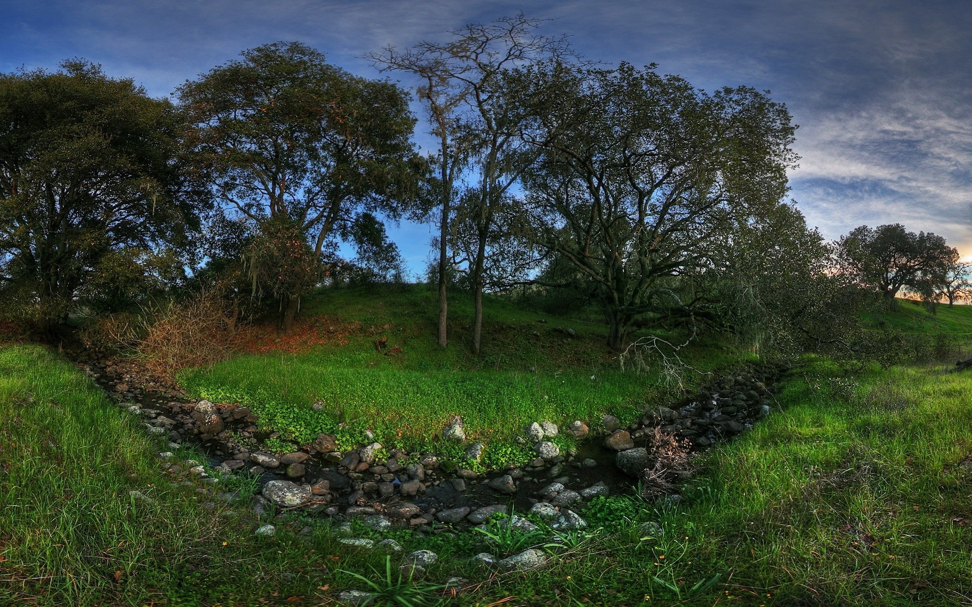 A landscape of mountainous terrain with a gloomy sky and a rainbow