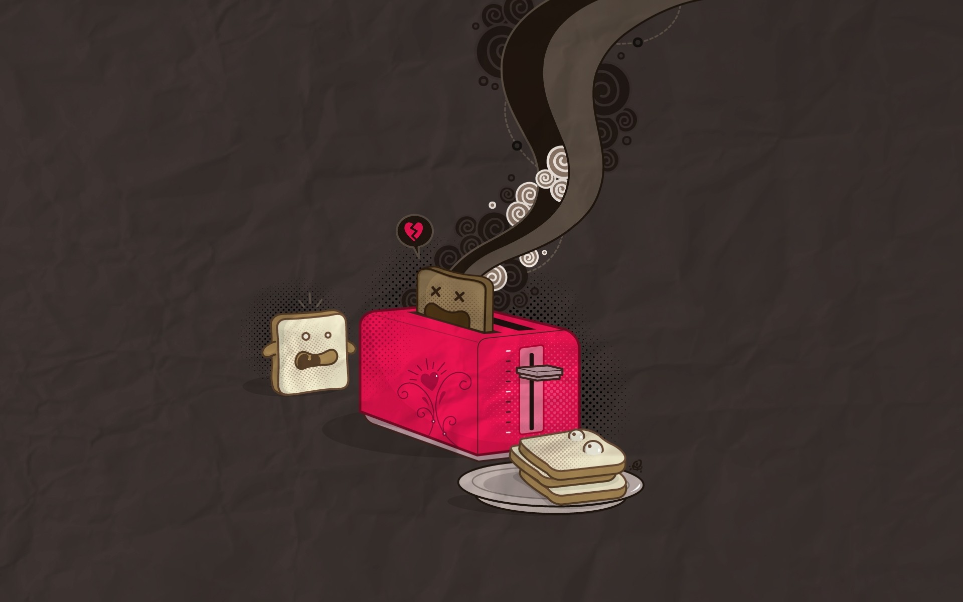 Drawing of overcooked bread with eyes in a steaming toaster on a background of crumpled paper