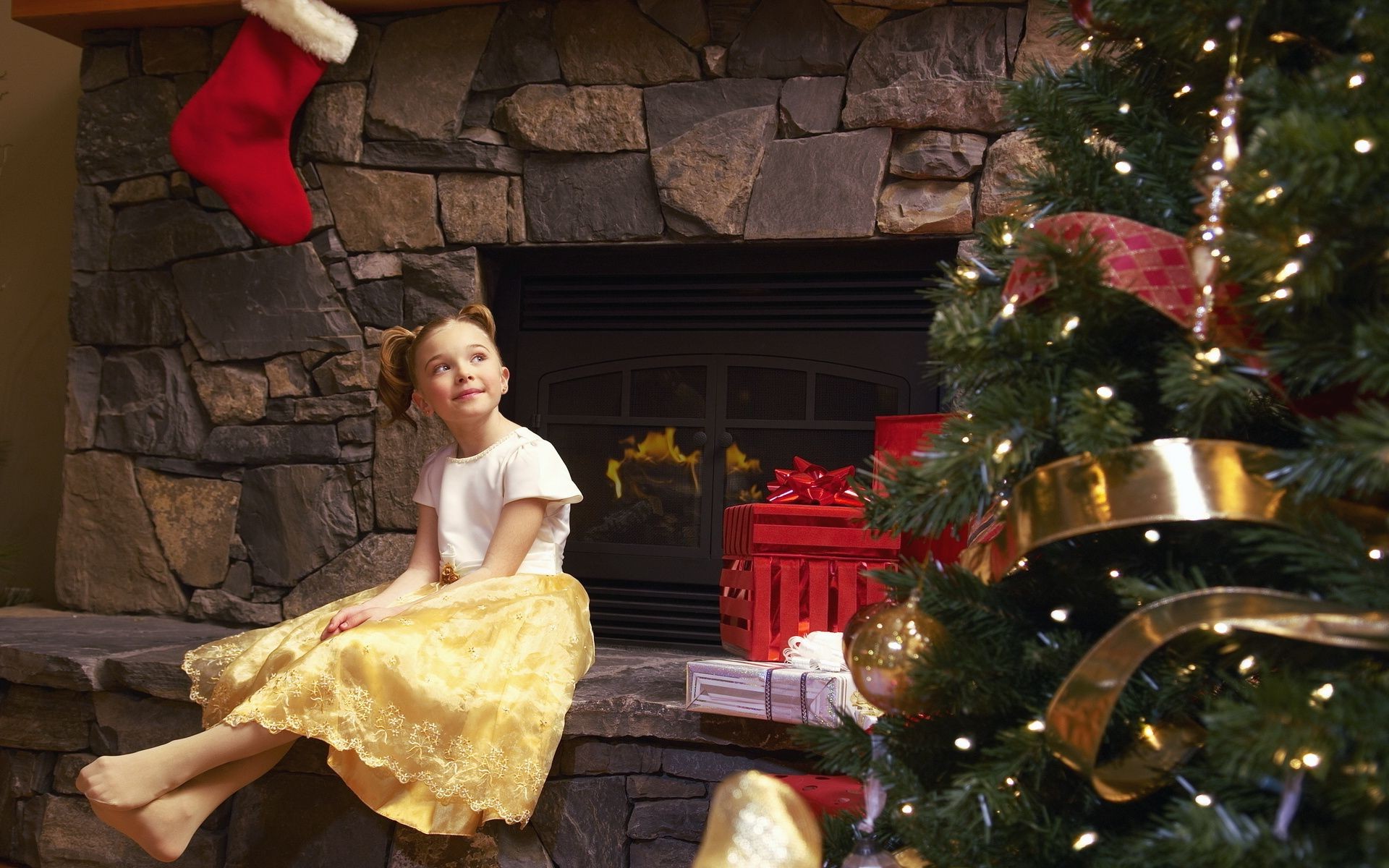 Waiting for a miracle. A girl by the fireplace and a decorated Christmas tree. Serpentine