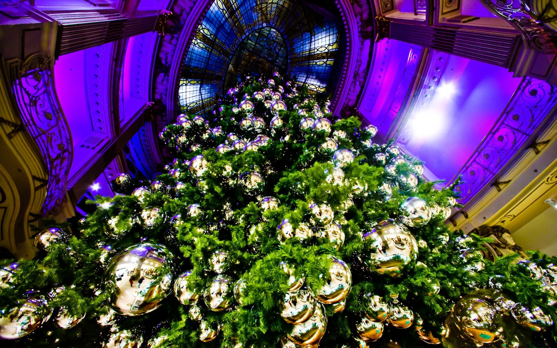 Photo of a Christmas tree decorated with golden balls from below