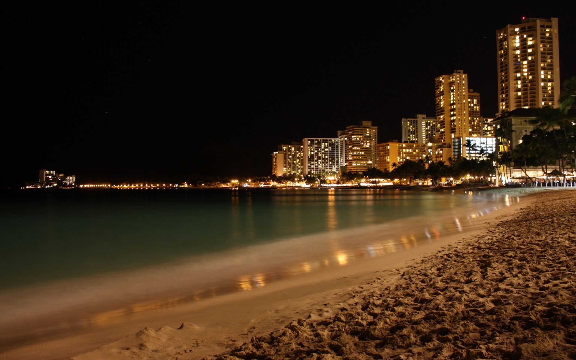 High-rise buildings at night near the coast